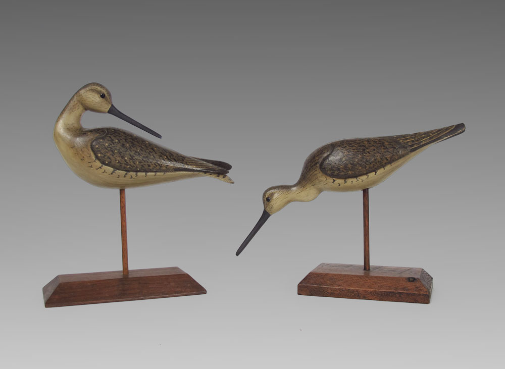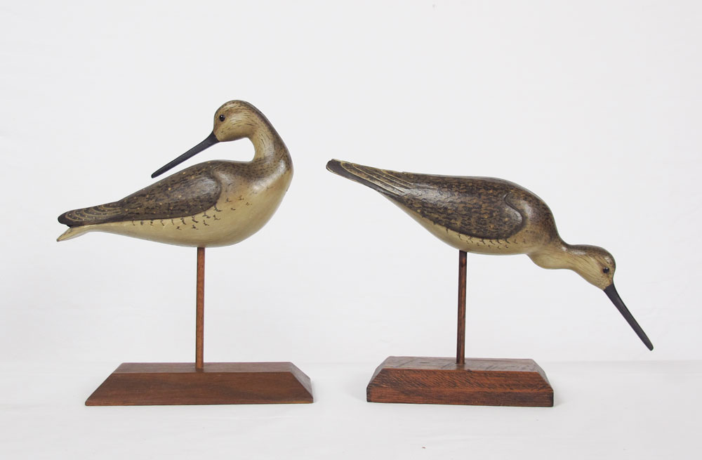 EXCEPTIONAL MOUNTED PAIR OF SHOREBIRD DECOYS: Signed GW. One feeding, one preening. Excellent paint detail, glass eyes and raised feathering. Largest approx. 11'' h. x 12'' x 4''.