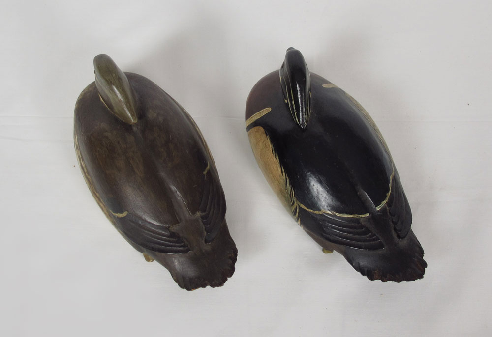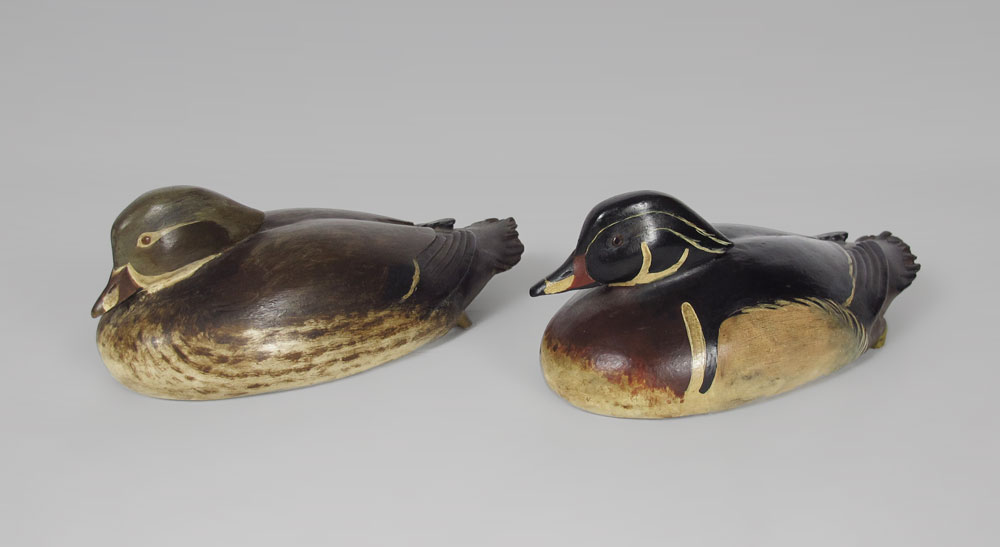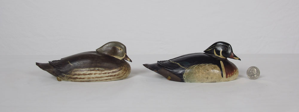 EXCEPTIONAL PAIR OF MINIATURE DUCK DECOYS: Male and female painted in exceptional detail with fine wing feather detail. Approx. 3'' h. x 7'' x 3 1/2''.