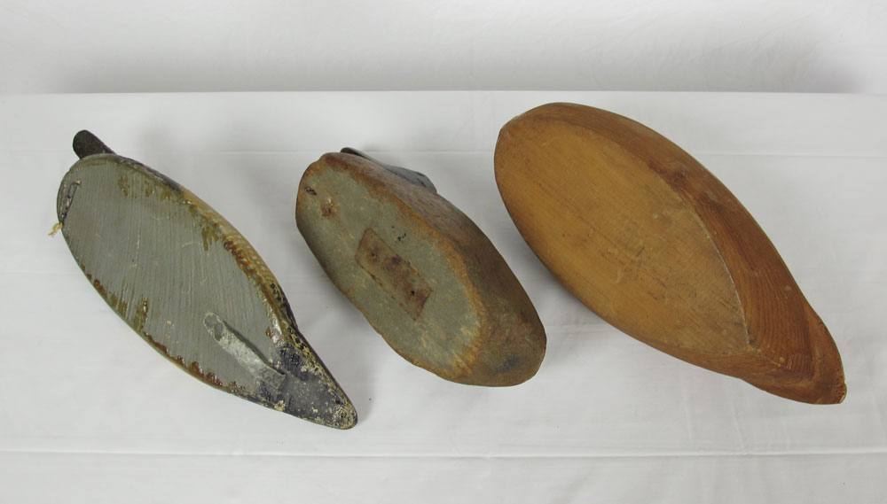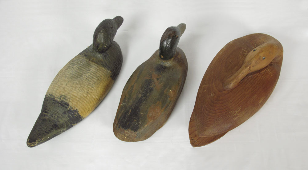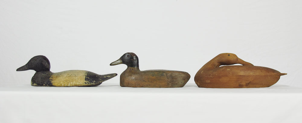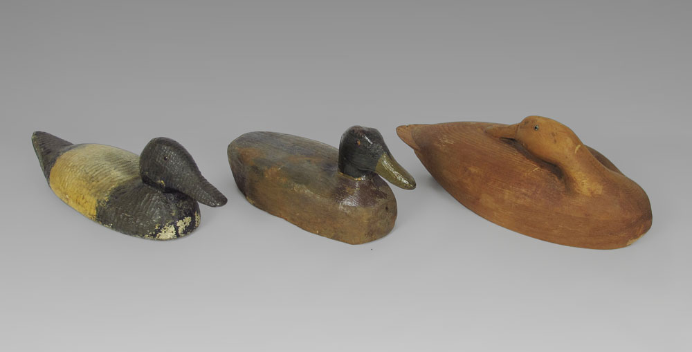 GROUP OF 3 WORKING DECOYS WITH GLASS EYES: Primitive in style, 2 are painted ad carved around the turn of the century. 1 natural wood with head cocked in unfinished condition. Largest approx.. 6 1/2'' h. x 16'' x 7''.