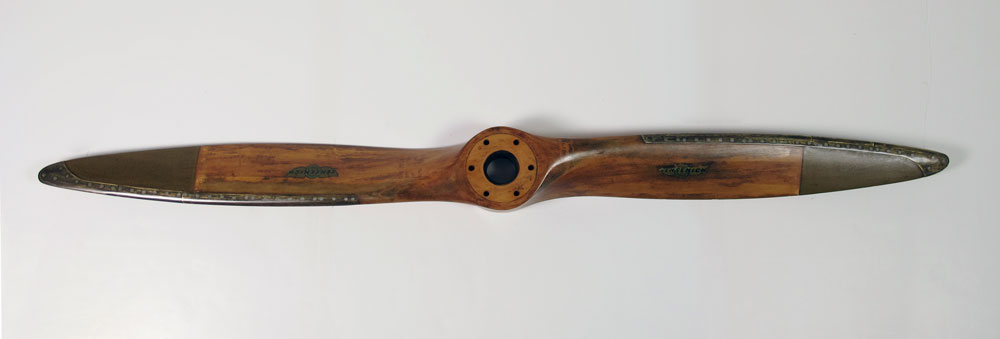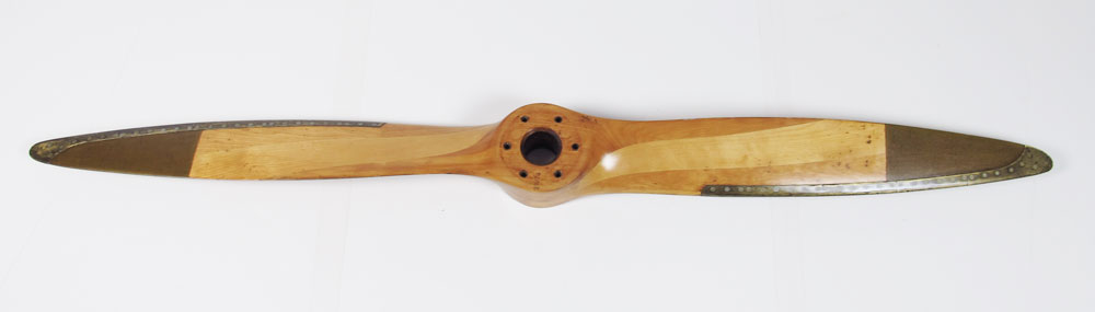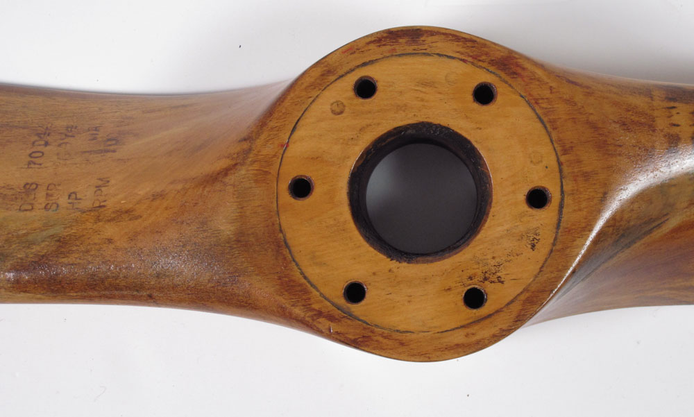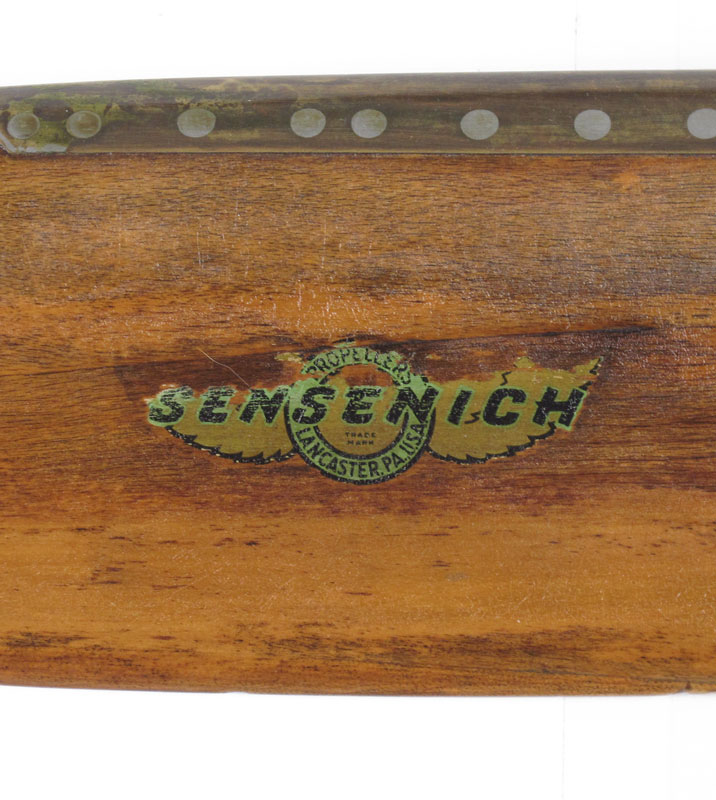 SENSENICH WOOD AIRPLANE PROPELLER: Partial original Sensenich decals with impressed DES 70D44, SER 29974, HP 80 MA, RPM 2700. Brass edges. 70 1/2''.