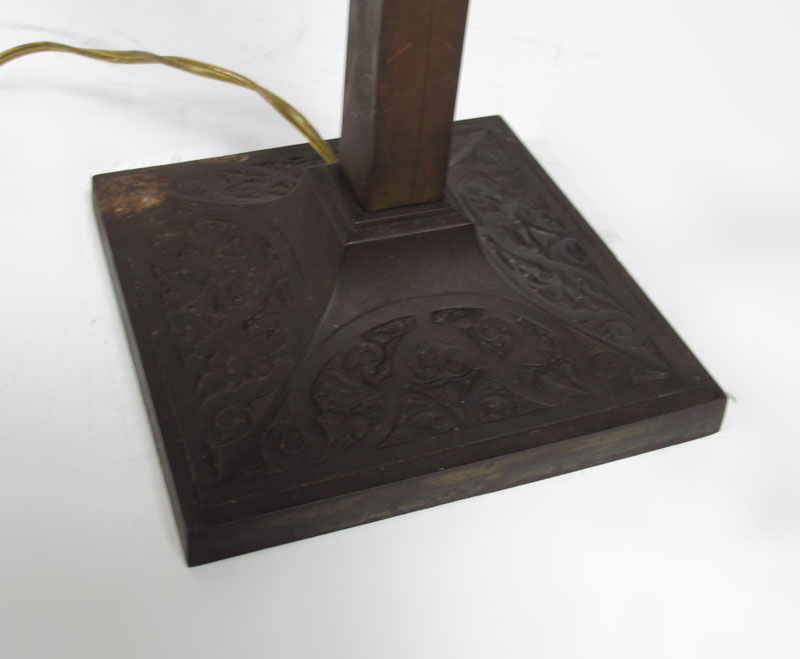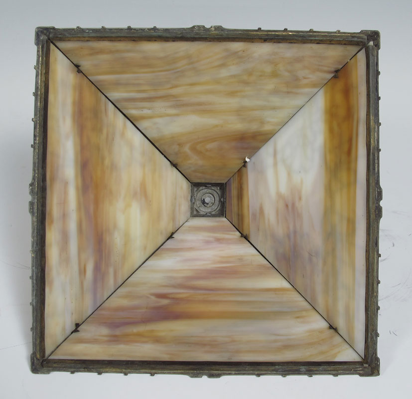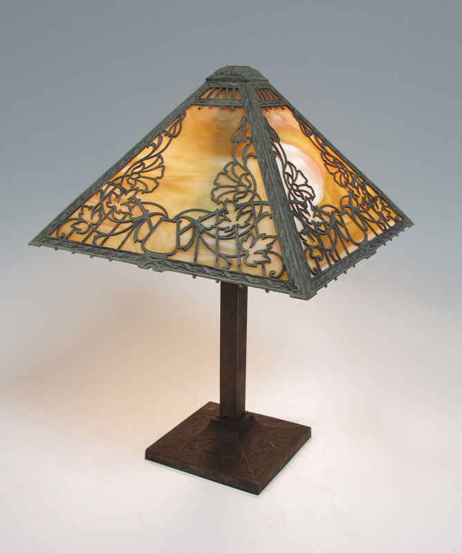 VINTAGE SLAG GLASS TABLE LAMP: Conical 4 panel shade of caramel slag glass panels under metal filigree. Embossed iron base, bronzed metal stem. Double socket, turn on switch in the wire. 20'' tall x 13.5: dia.