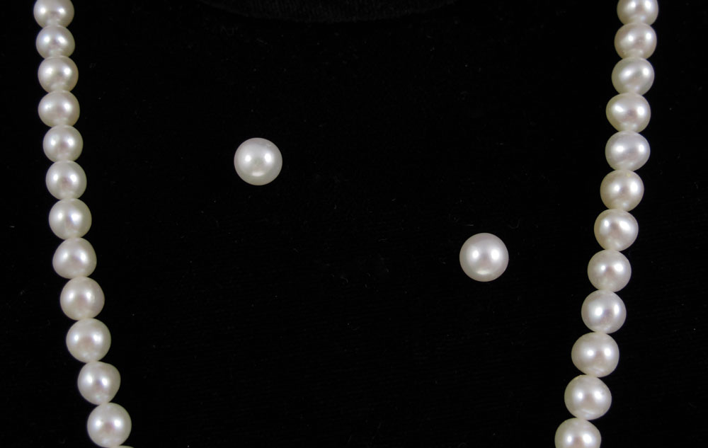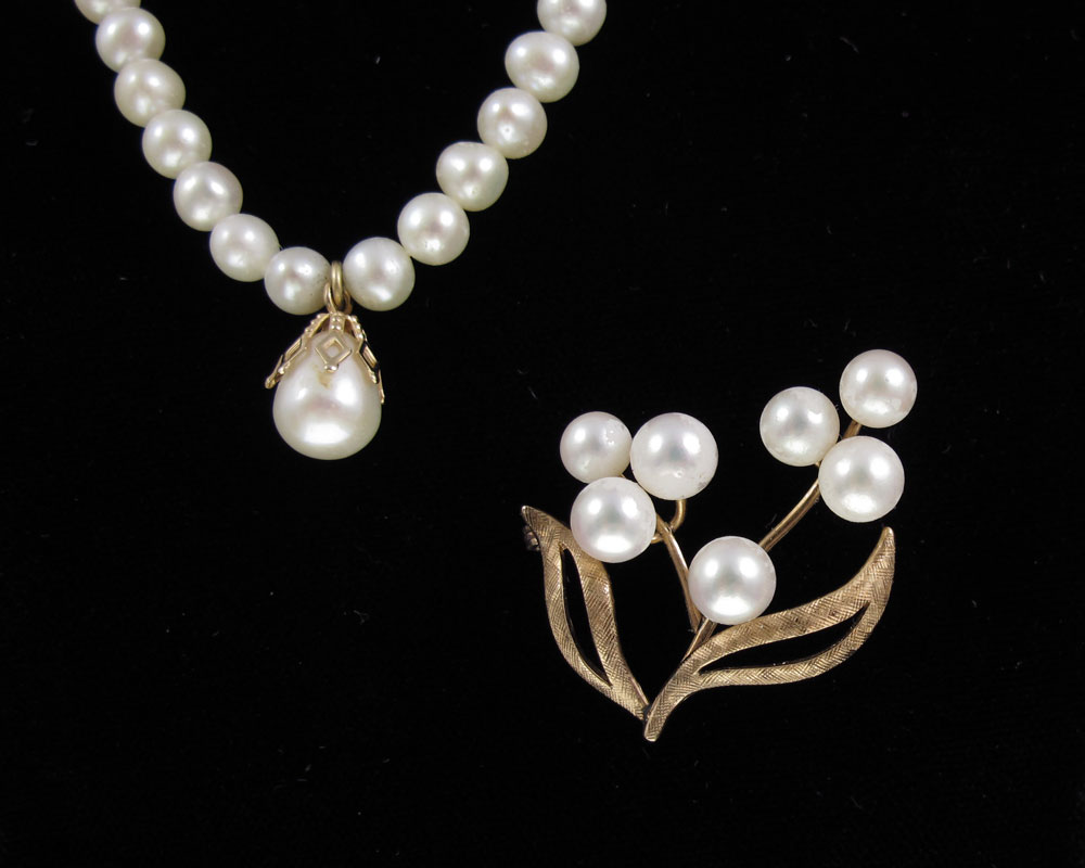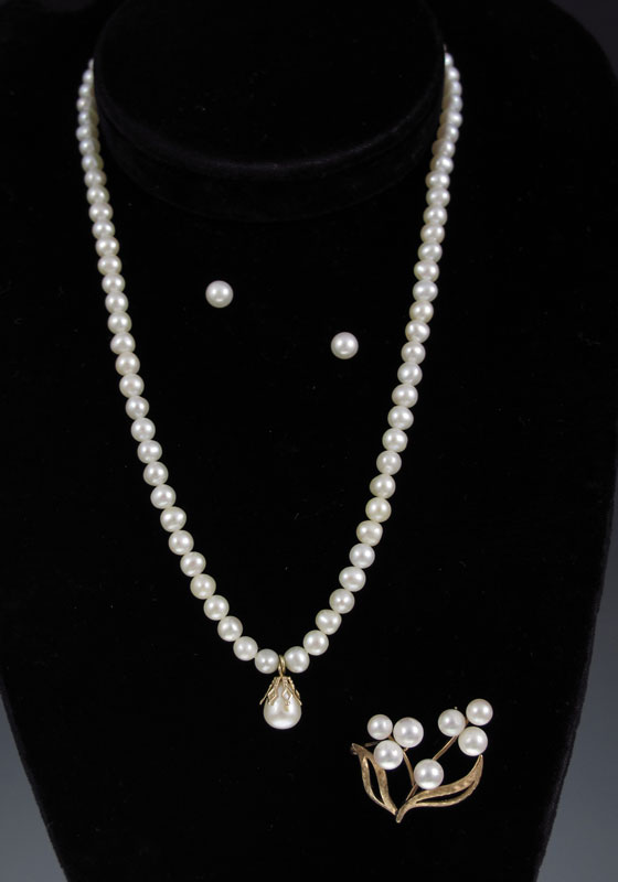CULTURED PEARL NECKLACE, EARRINGS AND BROOCH: Set in 14K gold. Group includes a 16'' strand of approx. 5.00 mm pearls, 5.50 mm post stud earrings and a 5.50-6.00 mm brooch. Some pearls are peeling.