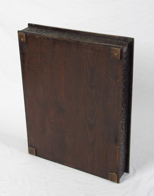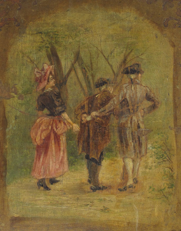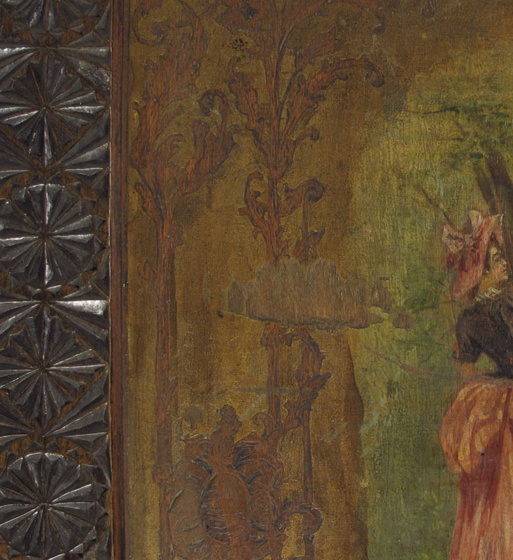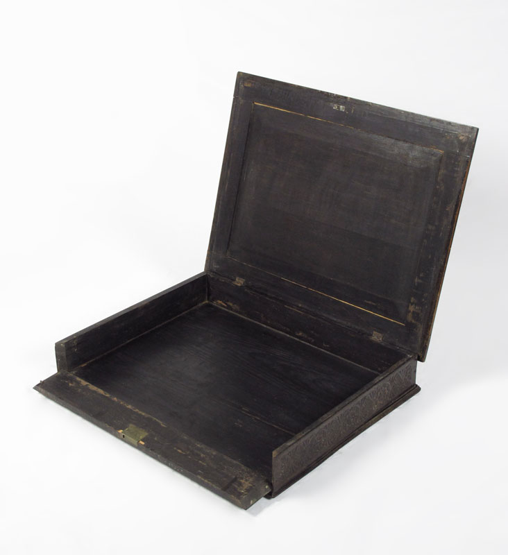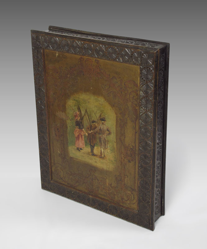 VICTORIAN CARVED AND PAINTED DOCUMENT BOX: Carved trim and sides with hand painted top panel featuring figures in woods. Key lock on side. 27 1/8'' x 21 1/4'' x 4 5/8.