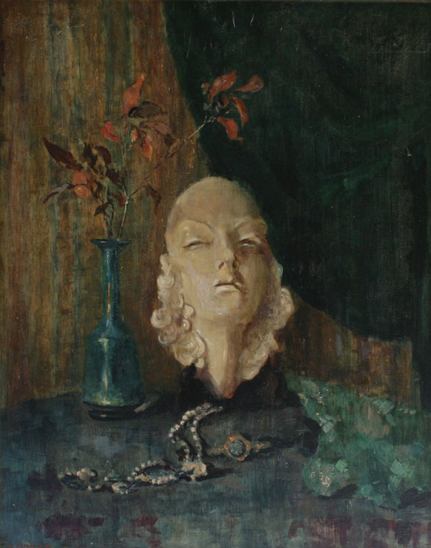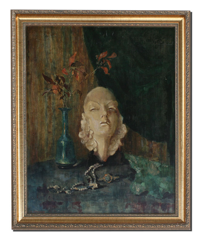 KLEINBARDT, Ernest, (American, 1874-1962): Still life with Sculpture and Vase with Flowers, Necklace on Table, Oil/Board 24'' x 20'', signed, framed, 27 1/2'' x 23 1/2''.