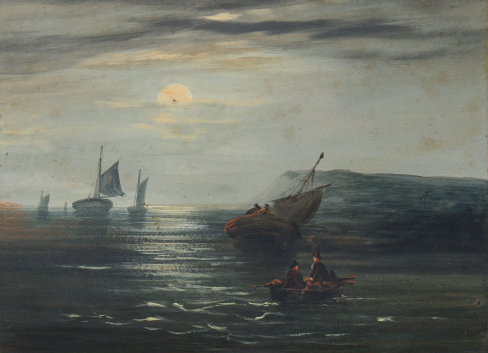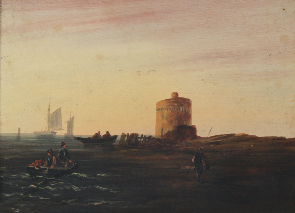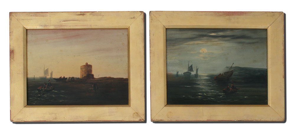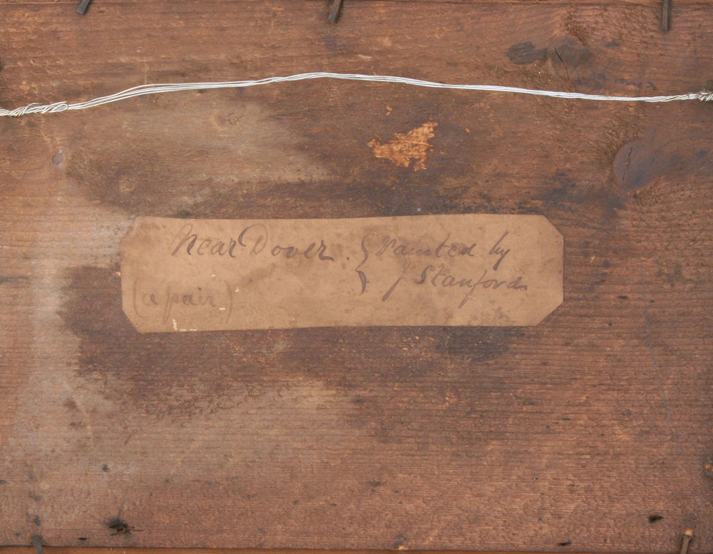 TWO PIECE OIL ON BOARD PAINTING LOT BY J. STANFORD TITLED NEAR DOVER: 6 1/2'' x 8 1/2'', signed and titled labels verso, encased in original gilded liners, 8 1/4'' x 10 1/2'', shows wear, one of paintings is signed on front.
