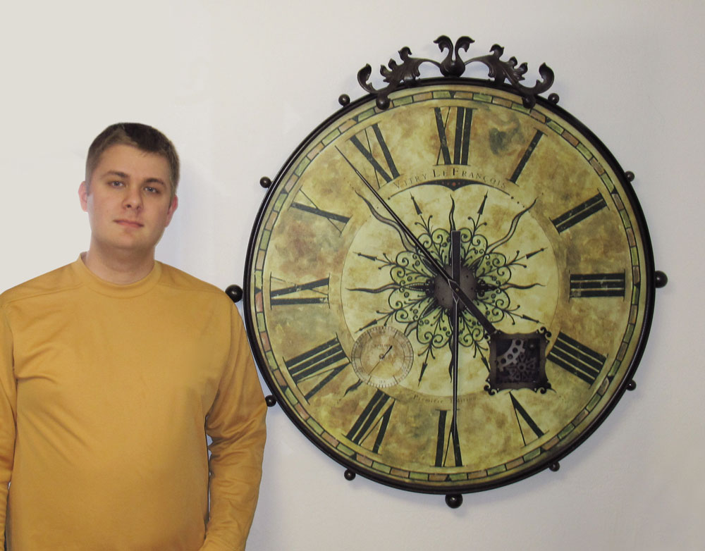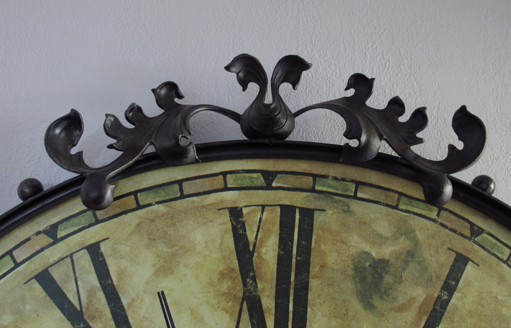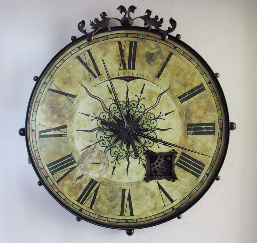 37'' DIAMETER FRENCH STYLE DECORATIVE CLOCK: Iron frame, contemporary decorator clock, battery operated, torque driven hands, in working order.