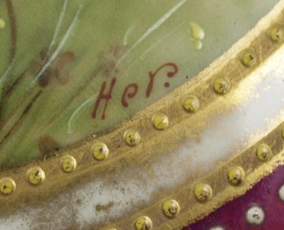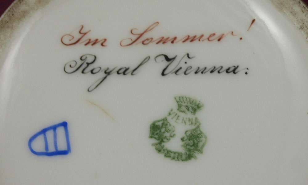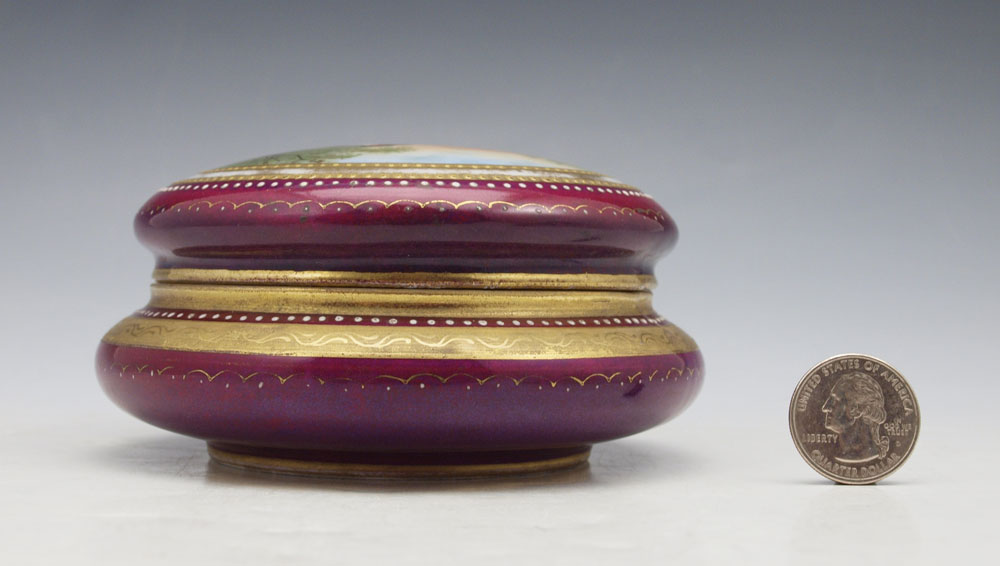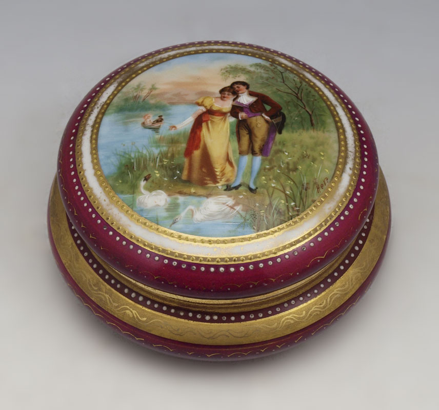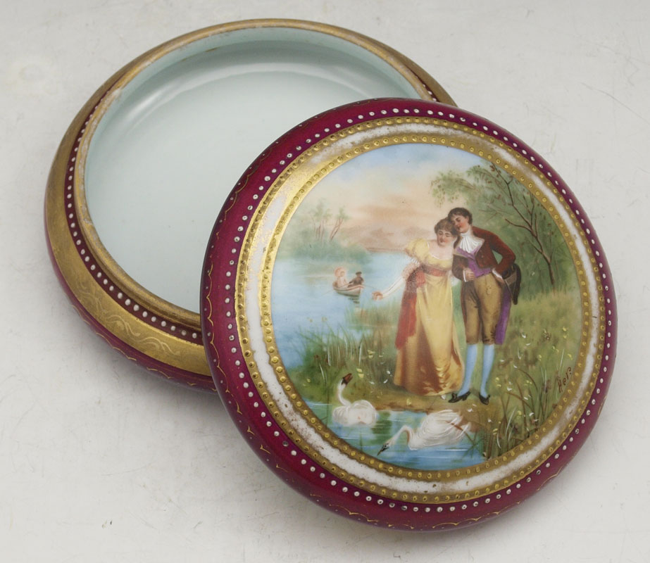 ROYAL VIENNA PORCELAIN BOX: Hand painted scene on lid of lovers beside pond with swans titled ''In Sommer''. Marked Royal Vienna with Beehive mark. 2 3/8'' h. x 4 7/8'' dia.