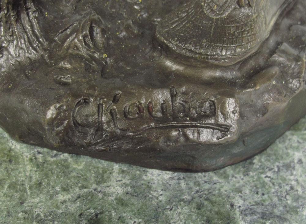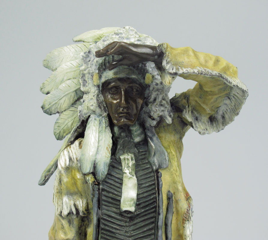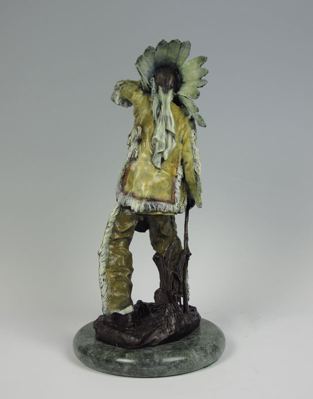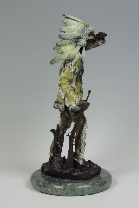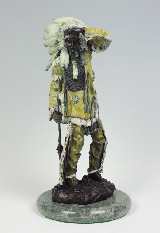 COLD PAINTED BRONZE AFTER CARL KAUBA: Indian Warrior Chief with Rifle Looking into the Distance, Bronze, 18''h, polished marble plinth, 20 1/2''h overall, incised signature.
