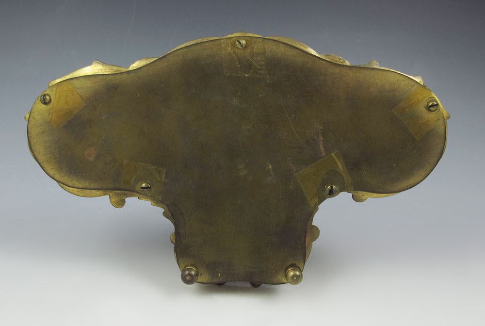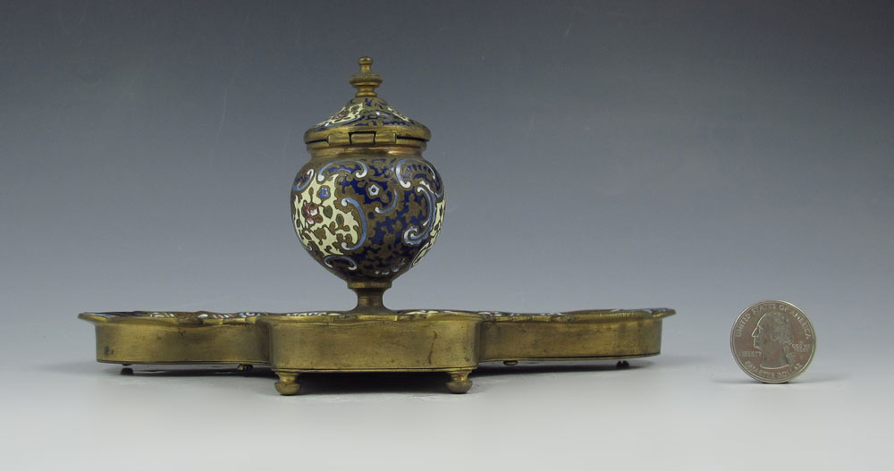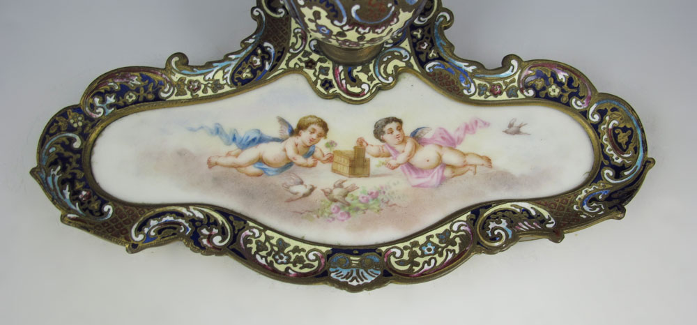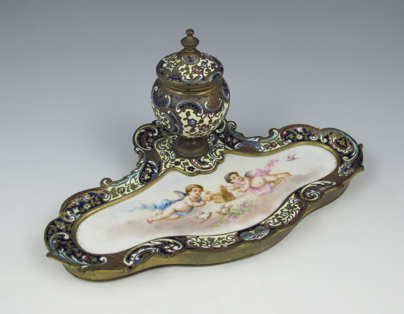 FRENCH BRONZE CLOISONNE & PORCELAIN INKWELL: Urn shape inkwell on bronze stand with hand painted porcelain tray featuring cherubs. Unmarked as to maker. 4'' h. x 8'' x 4 7/8''.