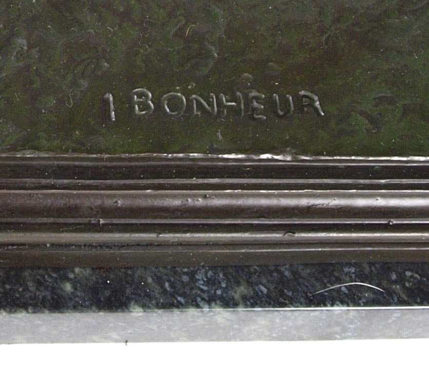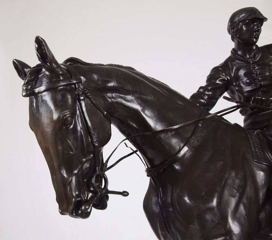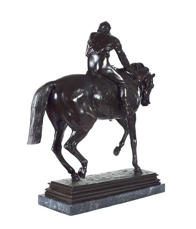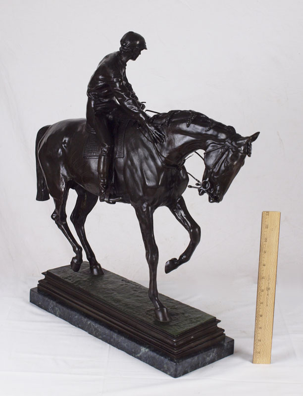 LARGE HORSE AND JOCKEY BRONZE AFTER ISIDORE BONHEUR: 23'' h x 24'' w, with green pedestal, 24''h overall, incised signature.