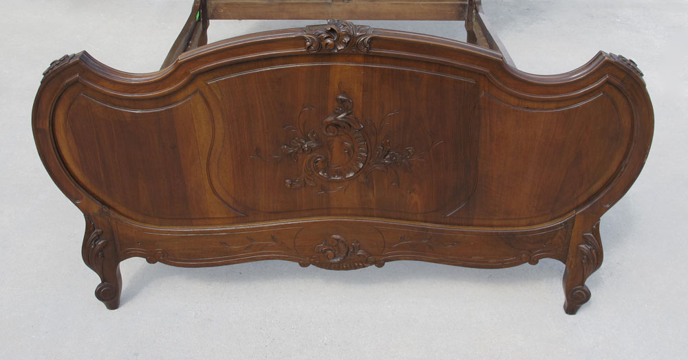 CARVED FRENCH BED: Headboard 65 7/8'' h .x 65'', Footboard 36 1/2'' h., rails 74'' l with 53 1/2'' wide opening.