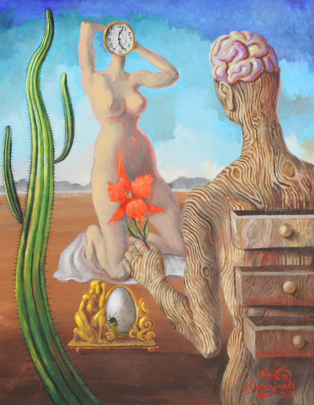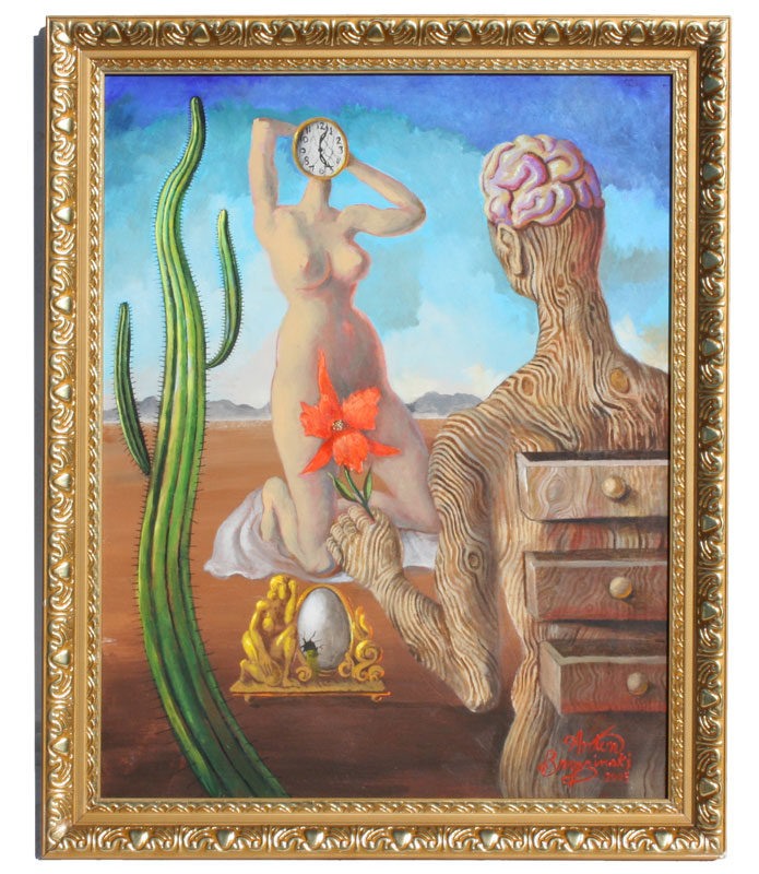 BRZEZINSKI, Anton, (American, 1946-): Surreal Dali-esque picture with Nude and Man, Oil/Board, 28'' x 22'', signed Anton Brzezinski lower right, dated 2005, framed, 32'' x 26''.