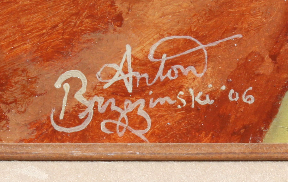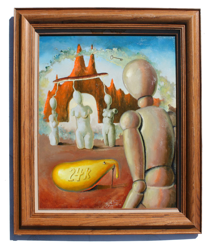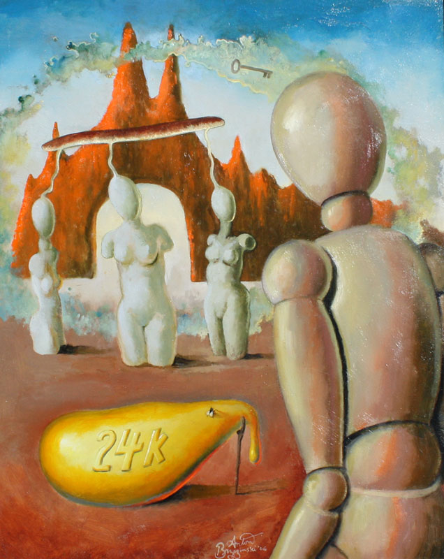 BRZEZINSKI, Anton, (American, 1946-): Surreal Dali-esque landscape with Doll Man and Nude female like figures in landscape, Oil/Board, 24'' x 20'', signed and dated 2006, framed, 31'' x 26 1/2''.