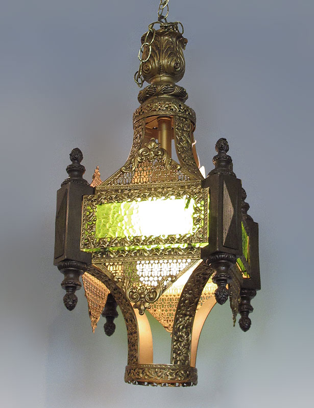 GOTHIC REVIVAL HANGING LAMP: Ornate floral and pierce work design metal with carved wood corners. Green glass inserts. Interior white glass shade. 29'' h. x 13'' excluding chain.