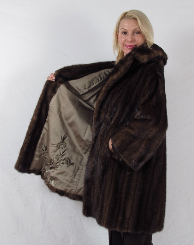 DARK BROWN MINK COAT: The collar is 11'' at the neck, bell sleeves. Approx 37''l., larger size.