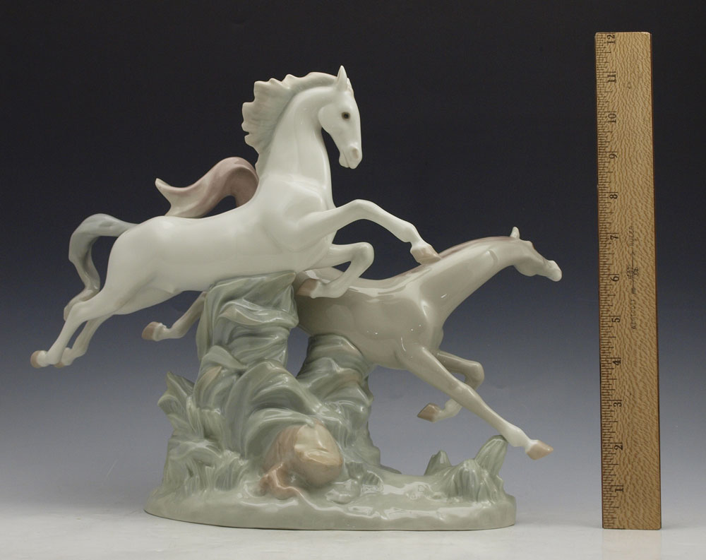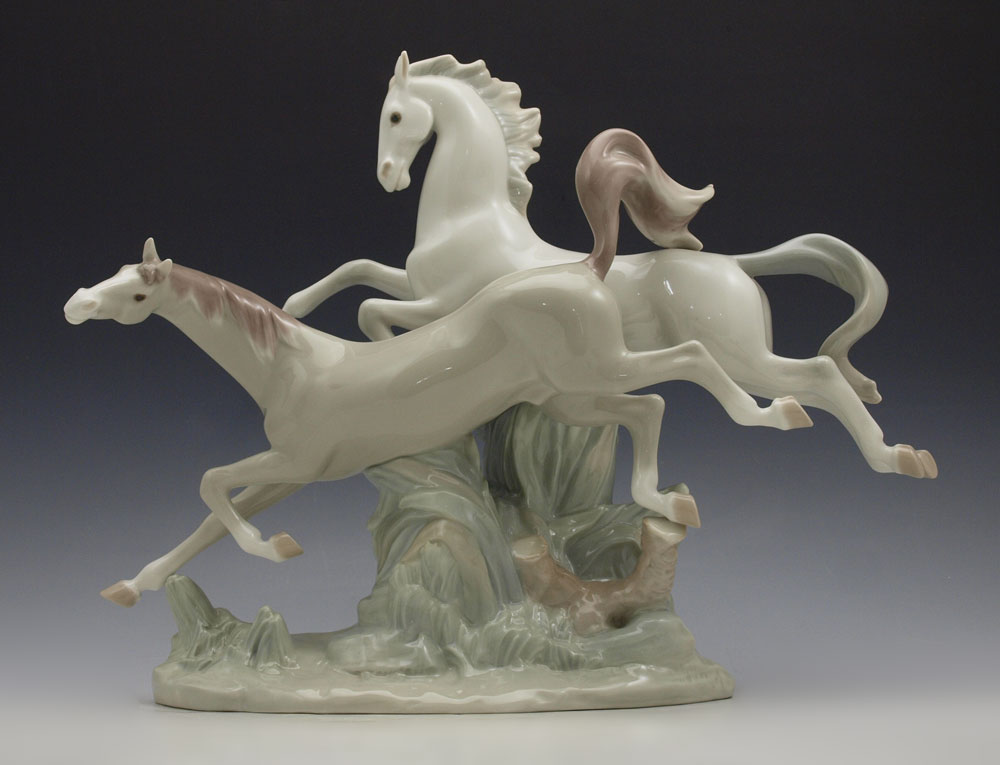 LLADRO HORSE GROUP CABALLOS AL GALOPE 4655: Retired in 2000. Designed by Vincente Martines. 11 1/2'' h.