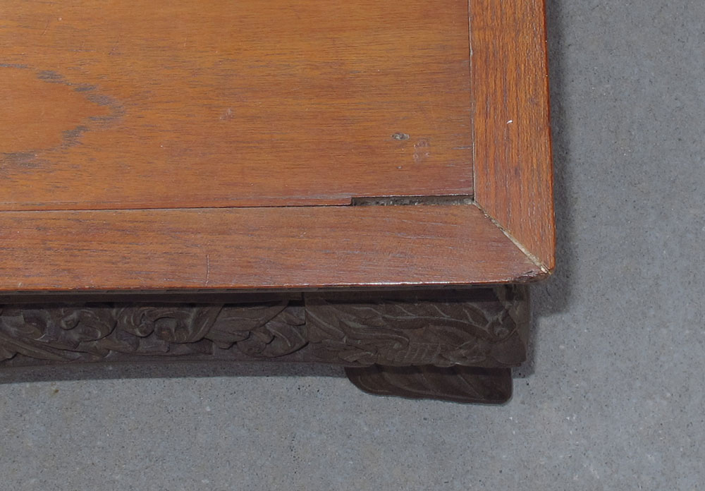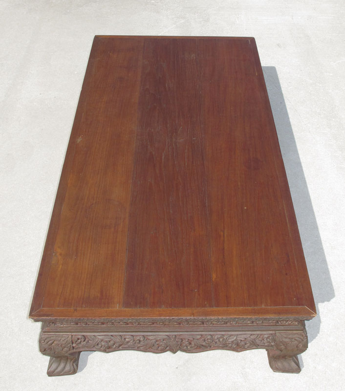 LARGE TEAK CARVED TABLE: Carved foliate scroll base with framed 3 board top. 16'' h. x 72 1/2'' x 36''.