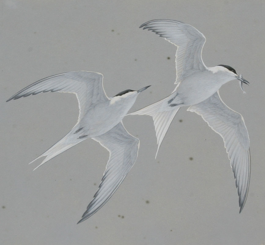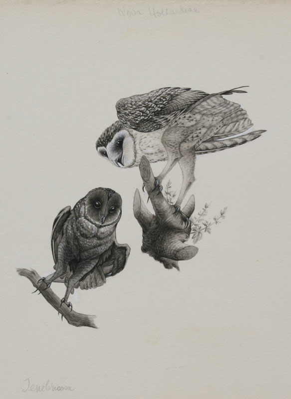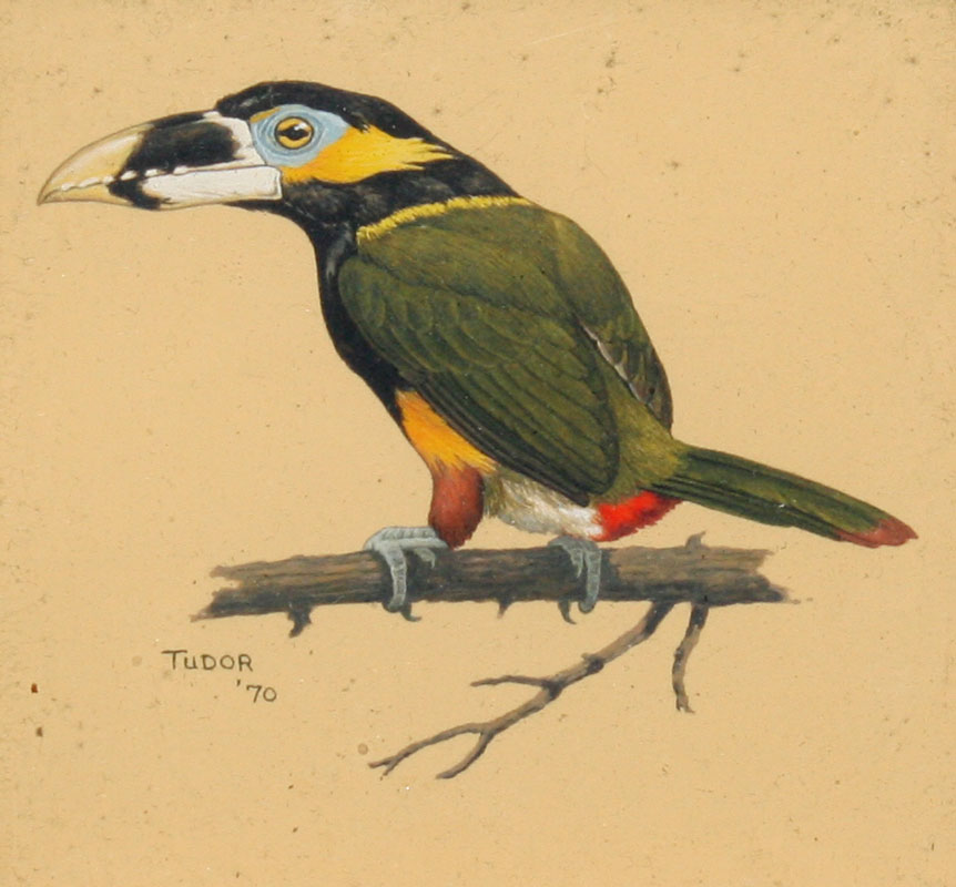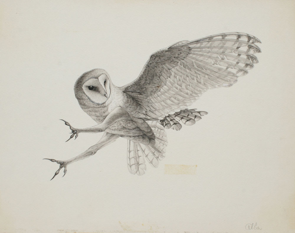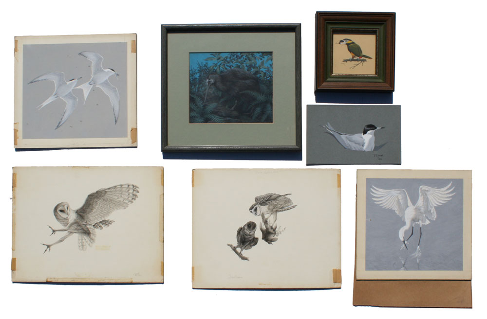 7 ILLUSTRATIONS OF BIRDS, SEVERAL SIGNED TUDOR: 1) Study of Owls, board size 10'' x 12 1/2''. 2) Study of an Owl, signed Alba, Watercolor, 9 3/4'' x 13''. 3) Gouache study of an Egret fishing, image size 7 3/4'' x 8 1/4'', unsigned, board 9 1/4'' x 9 3/4''. 4) Gulls in flight, image size 8'' x 9'', board 9 3/4'' x 10 1/2'', unsigned, several scattered spots of staining. 5) Nesting Gull, Gouache, 5'' x 8'', signed lower right Tudor, dated 60. 6) Watercolor of large Billed Tropical Bird, sight size 3 1/2'' x 3 1/2'', signed and dated 70, framed. 6 1/2'' x 6 1/2''.