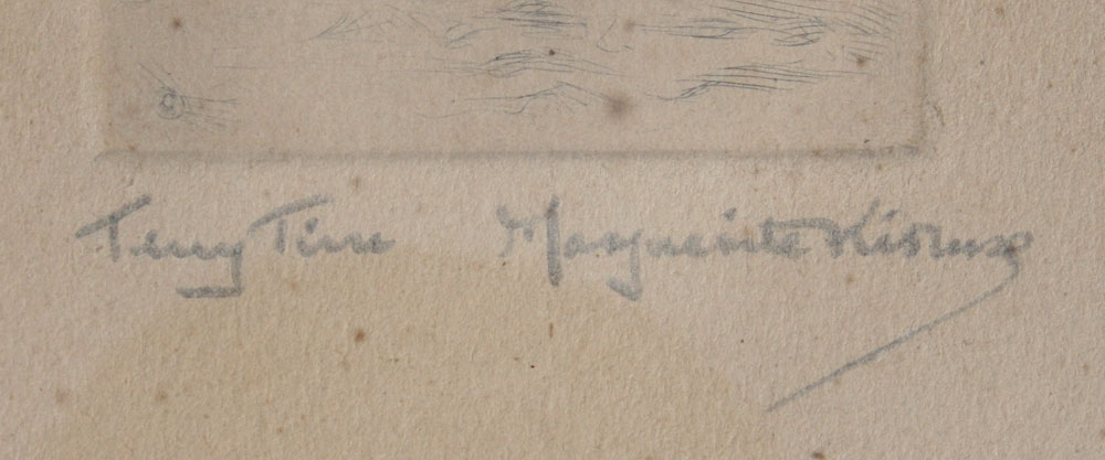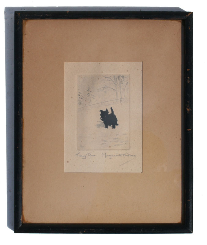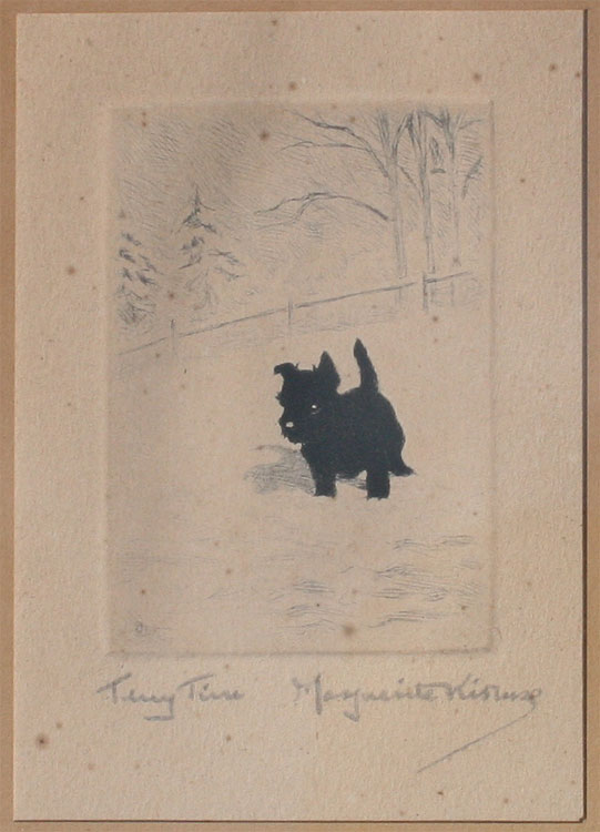KIRMSE, Marguerite, (American, 1895-1954): ''Terry Time'', depicting a black terrier in snowy landscape, Drypoint Etching, sight size 5'' x 3 1/2'', pencil signed and titled, original worn black painted frame, 10'' x 8''.