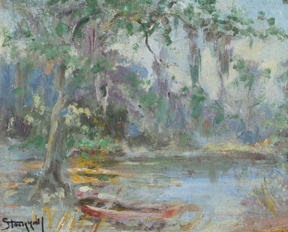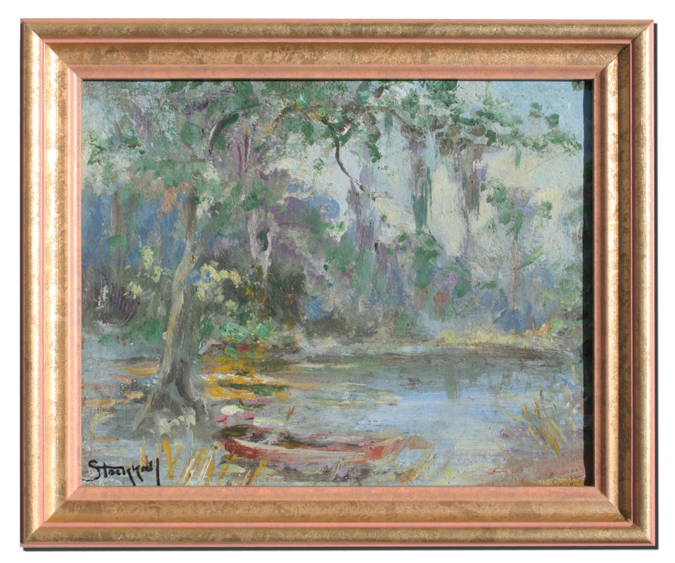 STOCKWELL, Catherine, (American, 1895-1983): Bayou Scene With Boat, Oil/Board, 8'' x 10'', signed, framed, 9 1/2'' x 11 1/2''.