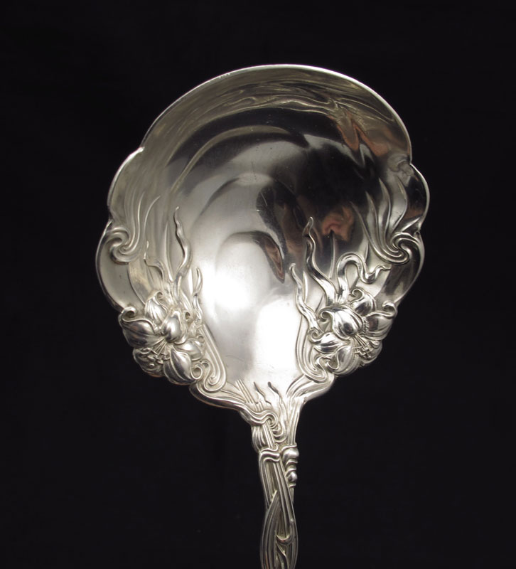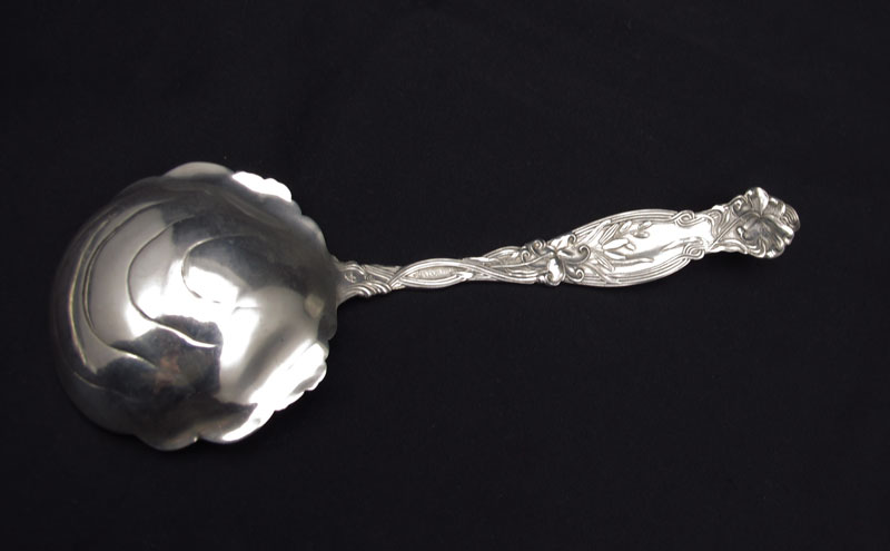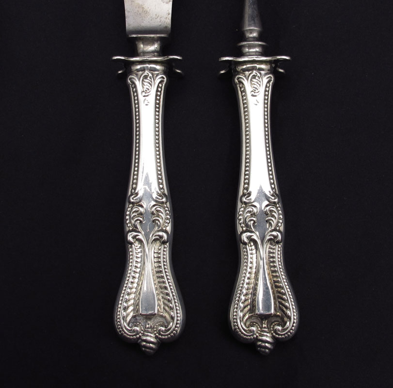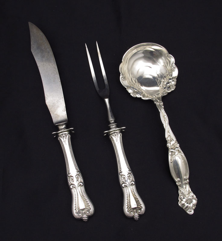 STERLING FRONTENAC BERRY SPOON & TOWLE CARVING SET: To include 1) Berry spoon in the Frontenac pattern by International silver, 8 1/4'' l. Approx. 3.1 troy oz. 2) Carving set in the Old Colonial pattern by Towle, fork (8 7/8'') and knife (10 1/4''). Approx. 4.1 troy oz.