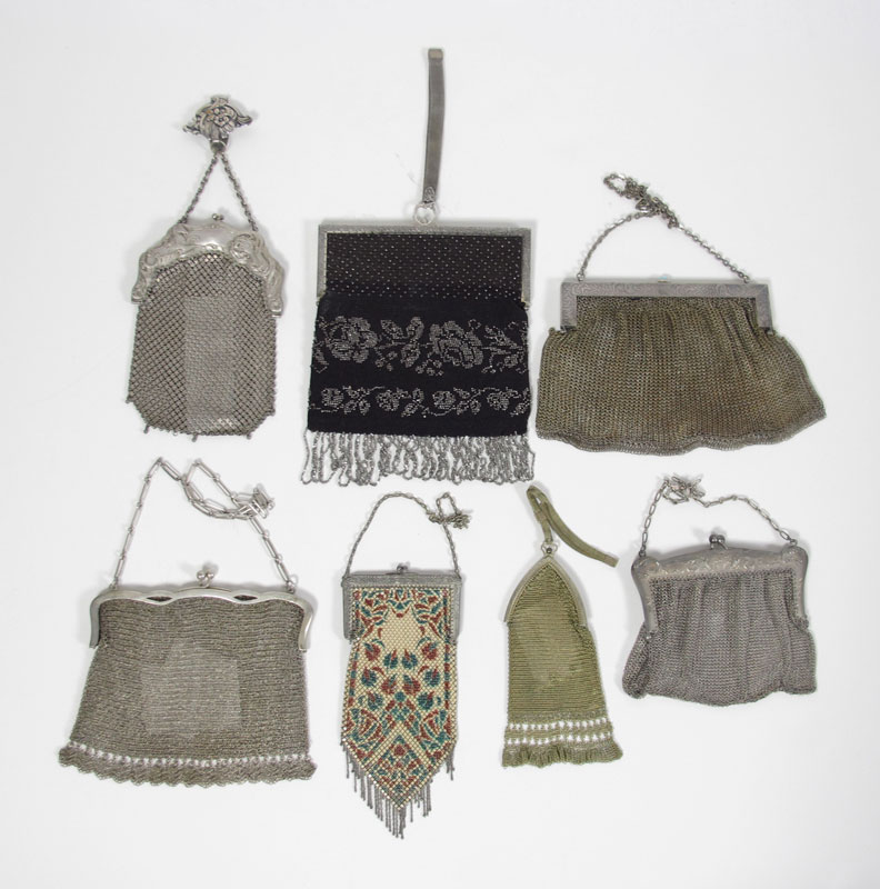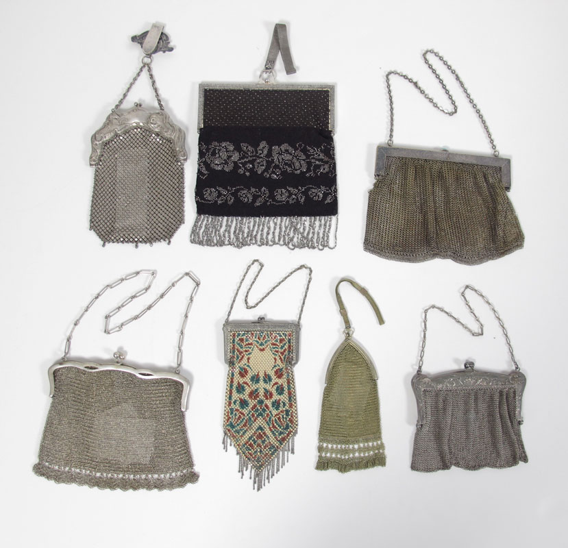 7 PC. VINTAGE MESH AND BEADED PURSES: To include 2 German silver bags, one with chatelaine hook, unmarked colored enamel mesh, two 800 silver purses, and a silver on black beaded bag, the largest at 7'' x 7''.