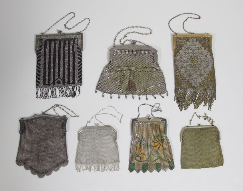 7 PC. VINTAGE MESH AND BEADED PURSES: To include Sterling mesh bag, 5'' x 4.5'', Deco enamel mesh purse, fine soldered mesh pure, large German silver purse, French two tone beaded purse, and a black and silver beaded purse (fringe coming undone).