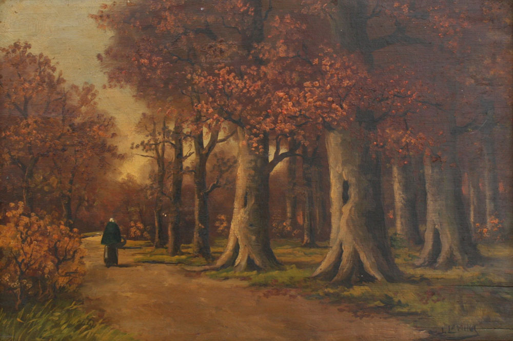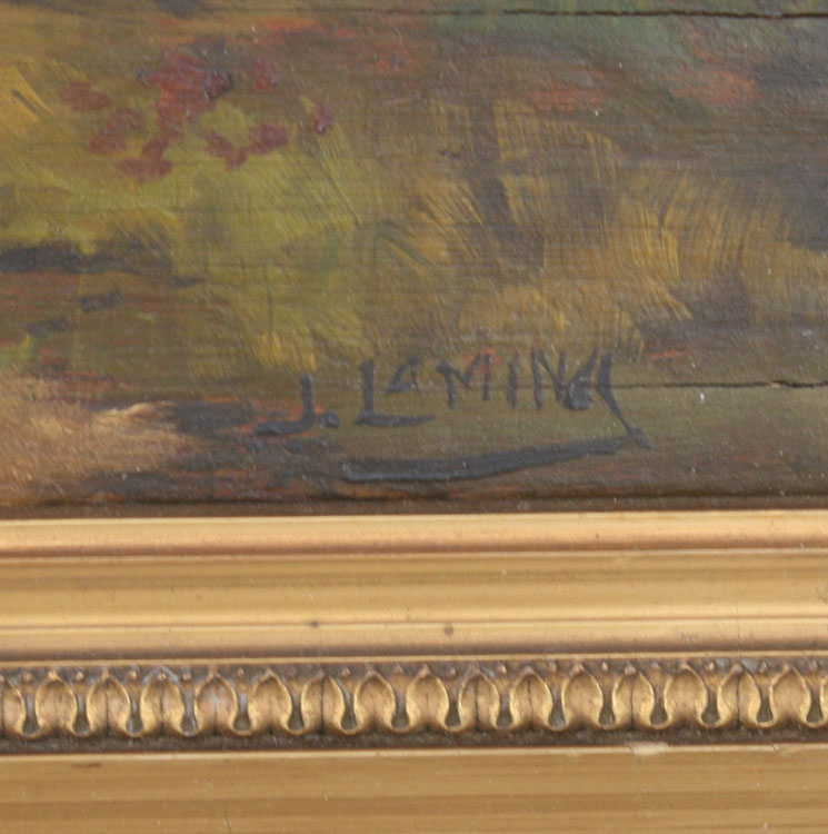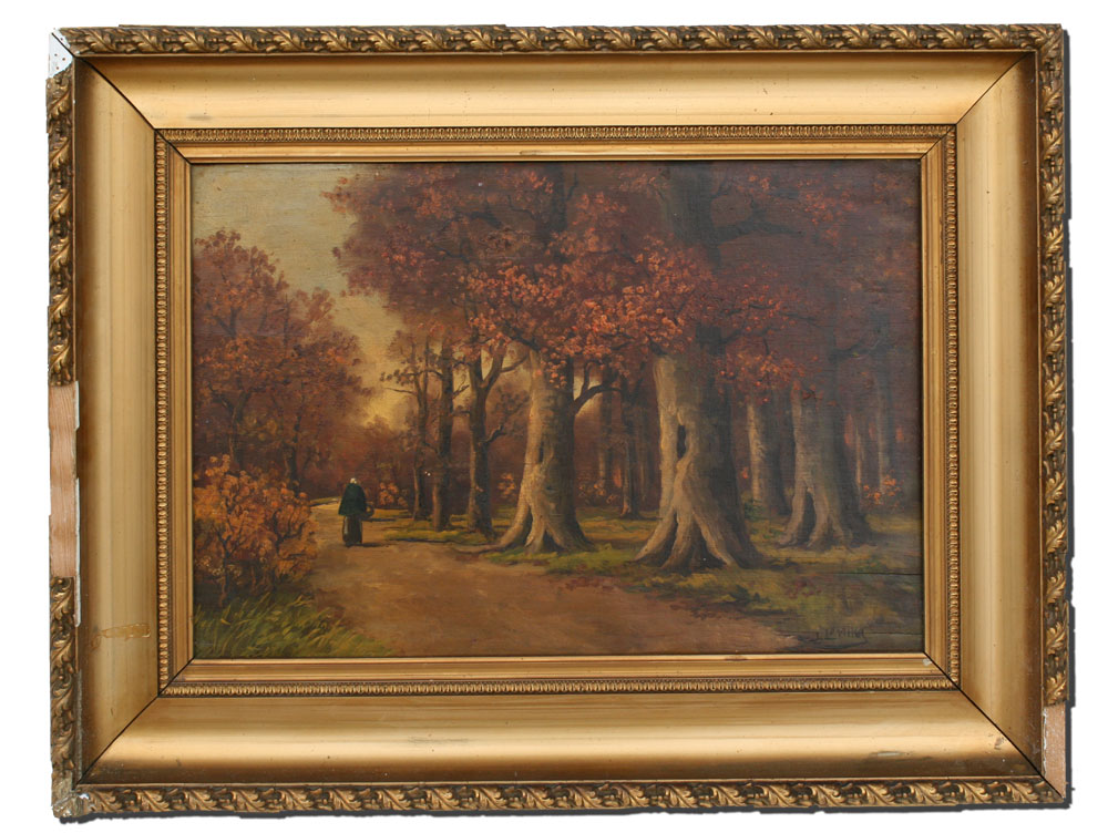 FOREST PATH WITH FIGURE, Oil/Board, 15 1/2'' x 23 3/4'', signed lower right J. Laminor?, gilded gesso frame with wear and missing gesso, 24'' x 32''.