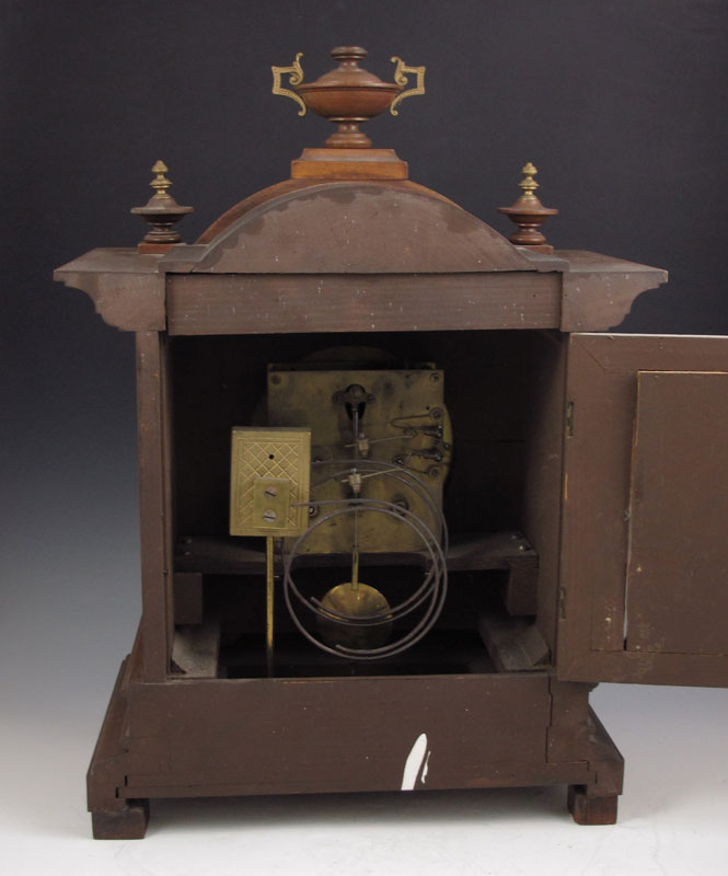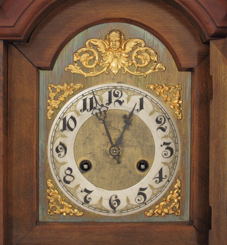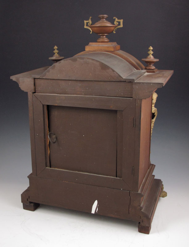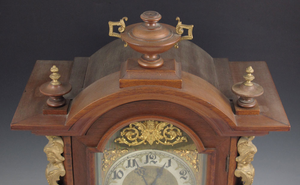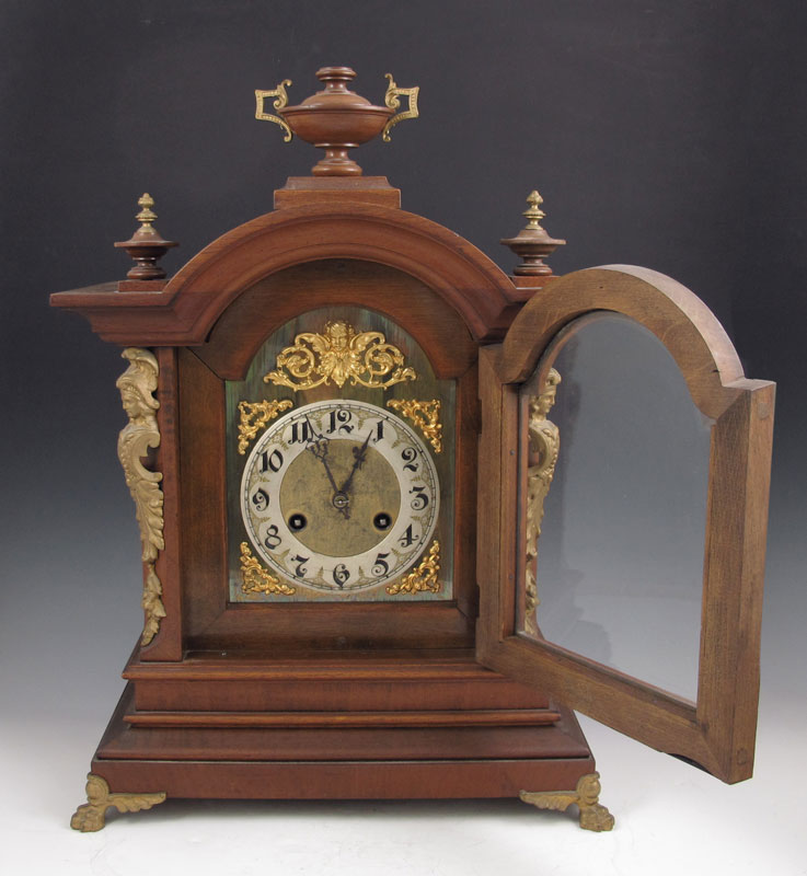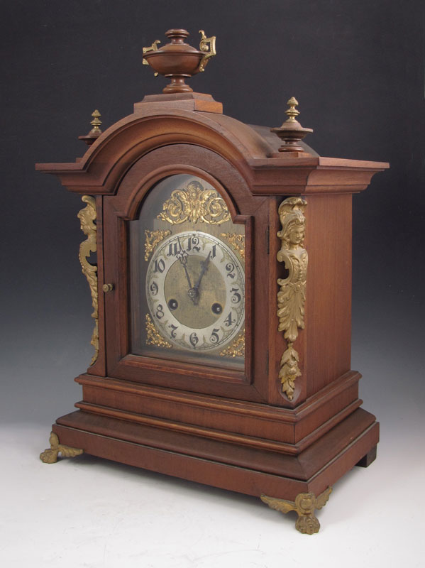 JUNGHANS WALNUT MANTLE CLOCK: German walnut case with urn finials and figural ormolu decoration and 2 paw feet. Silvered dial with Arabic numerals and applied gilded putti and floral decoration. Key and pendulum movement marked with Junghans star. Key and pendulum in office. 17 7/8'' h. x 13 3/4'' x 8 1/4''.