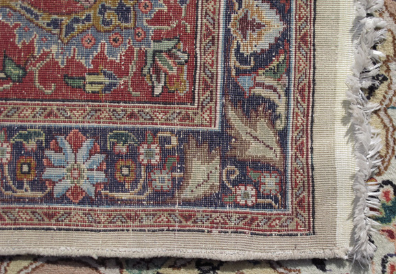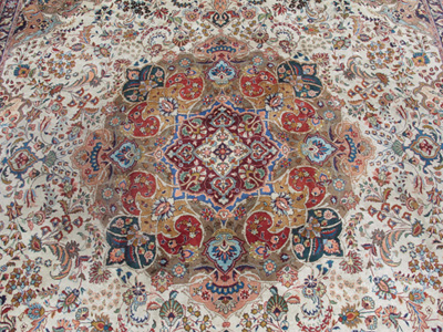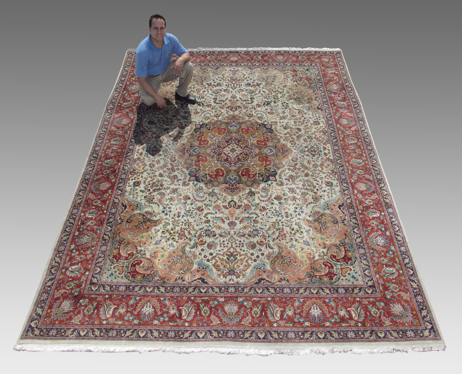 MODERN PERSIAN HAND KNOTTED WOOL RUG, 10' 1'' x 13' 5 '': This beautiful Mahal or Tabriz carpet demonstrates the best in Persian weaving. The colors and the design of this carpet make it a true work of art. The round central medallion drawn in shades of blue, peach, rust red, golden beige, and a deeper red looks like a jewel set on an ivory field that is covered with smaller design motifs drawn in the same colors. The corner spandrels of peach and red draw the eye back to the center. The main border has the same red rust color ground with palmettes and flowers. The guard borders use a deep blue ground to complete the ''frame''. There is a small signature mark at one end of the carpet in the middle of the last guard border. Condition is very good.