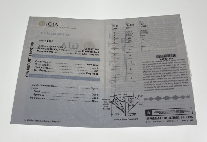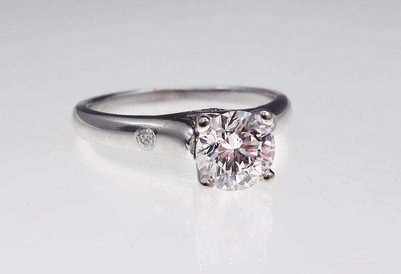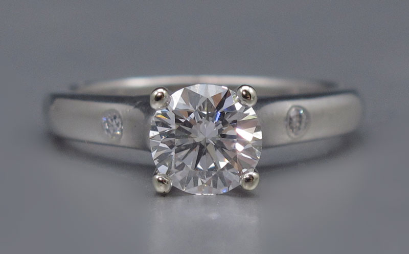 PLATINUM DIAMOND SOLITAIRE: Platinum ring centering a .97 Ct, round brilliant cut diamond with GIA laser inscription registry number. This diamond is rated a near colorless G, and VSI clarity rating. The mounting is also set with an additional 4 round brilliant cut diamonds, approx. .08 Ct., VS in clarity and G in color. The center diamond is prong set, the smaller ones are deep set. Size 6. Weight 5.2 grams. Sold with current Atlanta Gemological GIA graduates appraisal for $10,000.