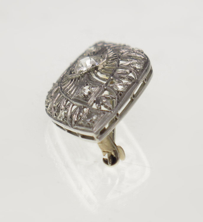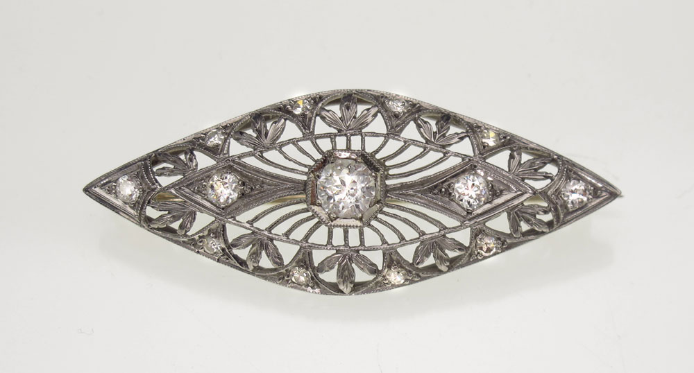1920s HAND CHASED PLATINUM DIAMOND BROOCH: Floral filigree platinum brooch contains five old European round cut diamonds and eight round single cut diamonds. The CENTER diamond approx. .48 Ct. Total diamond weight approx. .50 Ct. The diamonds average VS in clarity and G-H in color. The diamonds are prong set. The pin, stem and clutch are 14K white gold. Bar pin closure. Weight: 5.4 grams. Length: 2'' Approx.