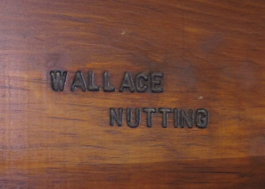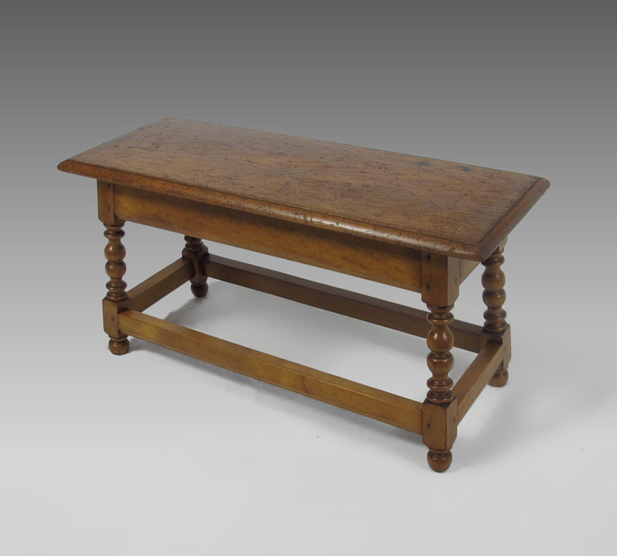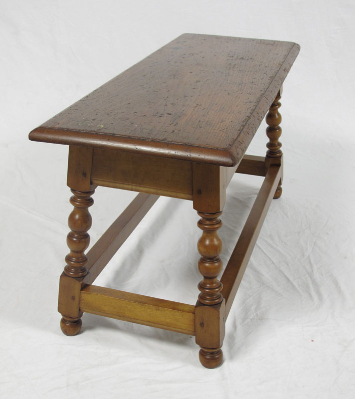 SIGNED WALLACE NUTTING MAPLE JOINT STOOL: Four leg bench seat, turned legs, low stretcher joints. Branded ''Wallace Nutting''. 18''h x 36''l x 14''.