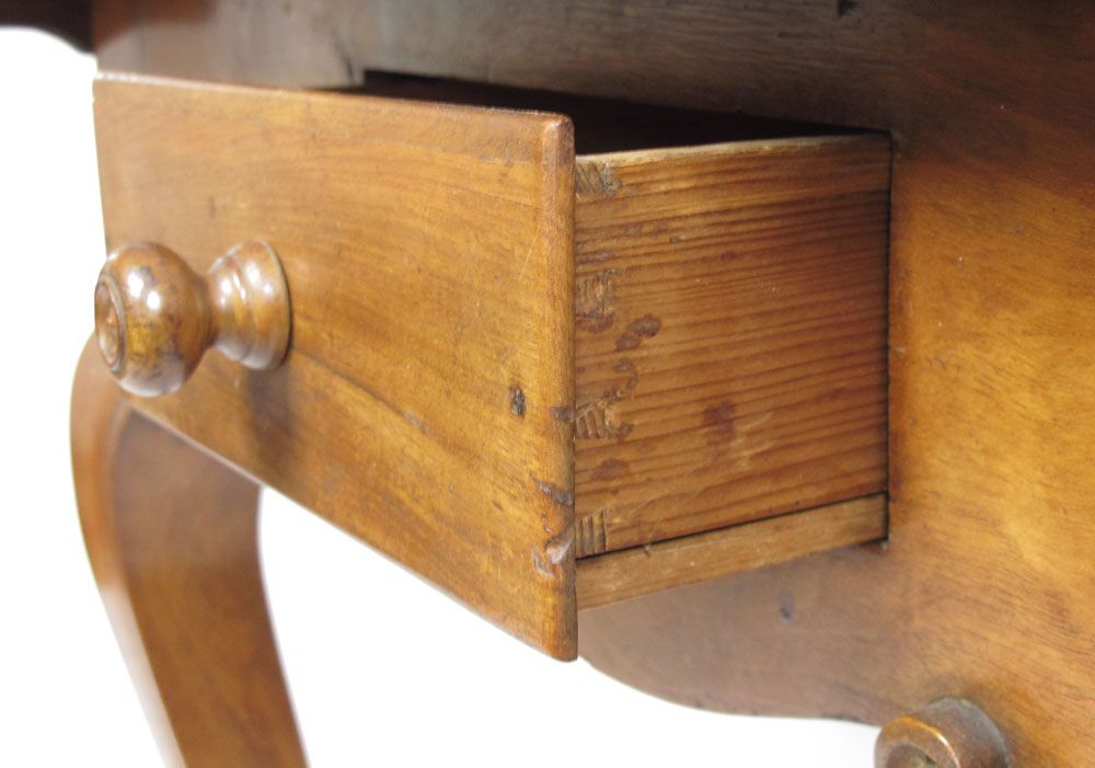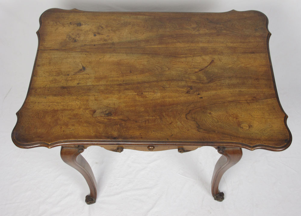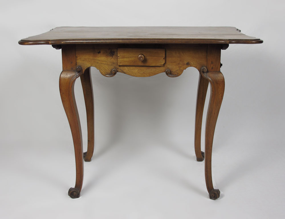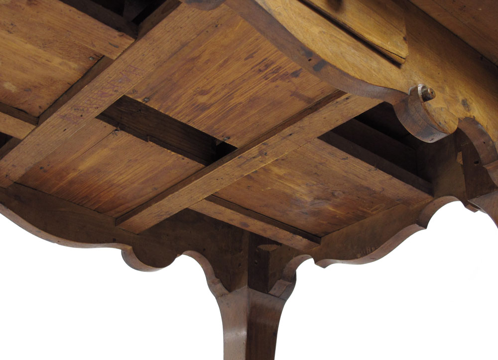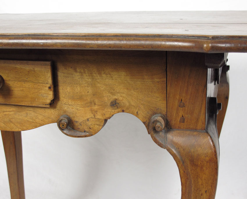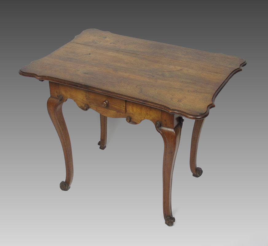 18TH CENTURY EUROPEAN CUSTOM GAMING TABLE: Single dovetail on 4 sides, early rosehead nail and pegged construction. Fine carved scroll detail over cabriole legs and French foot. Shaped top with honey colored patina. 30'' x 39 1/2'' x 28''.