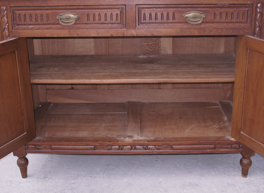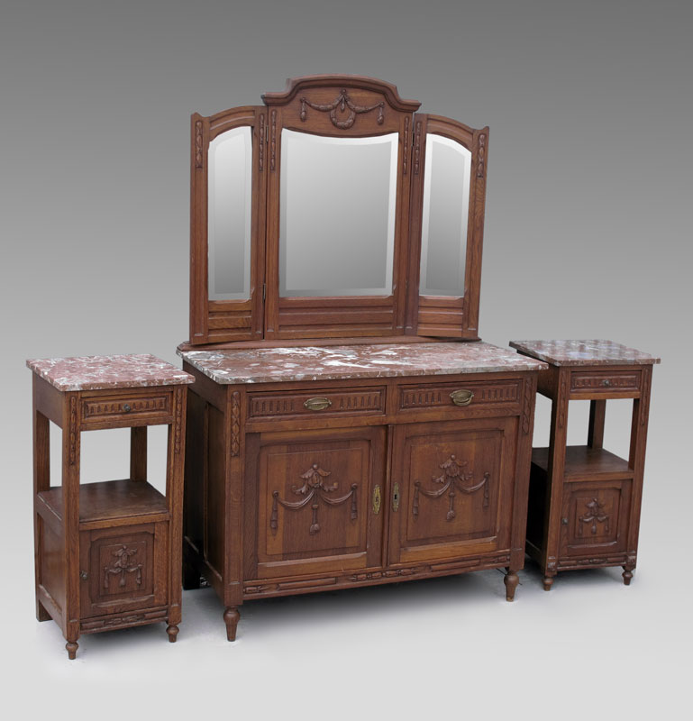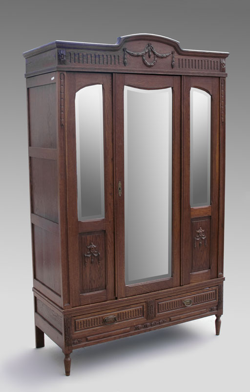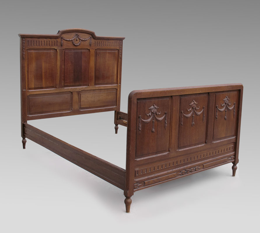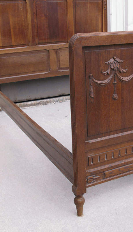 EARLY 1900s ENGLISH OAK BEDROOM SET: To include ARMOIRE, Full size BED, mirror top DRESSER with mirror, and pair of NIGHTSTANDS: Armoire 87'' h. x 55'' w. x 23''d. Dresser 71 1/2 '' h. x 54 3/4'' w. x 20'' d. Bed Headboard 56'' h. x Footboard 37 1/2'' h. x 54 3/4'' w. x 83'' d. Nightstand 33 1/2'' h. x 16'' w. x 16'' d.