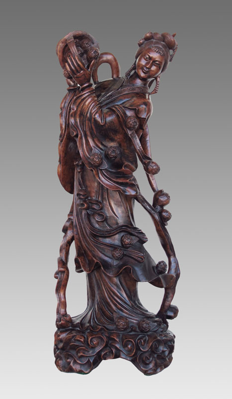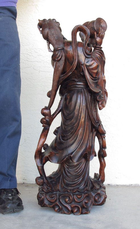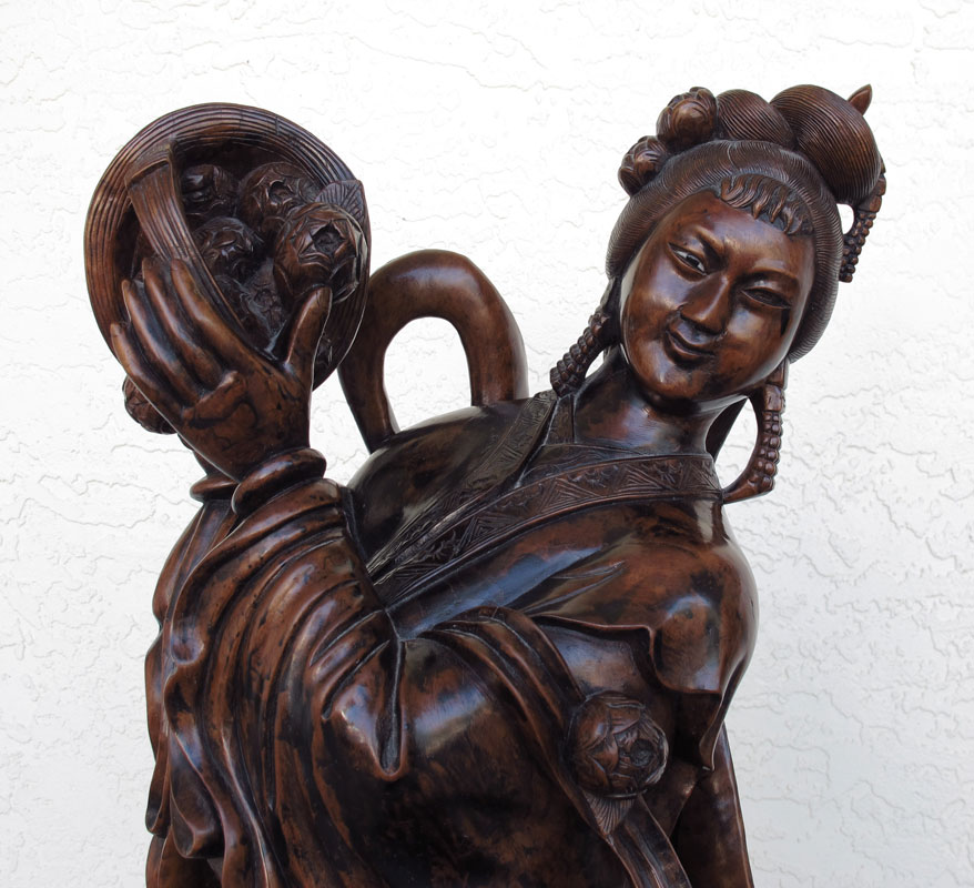 CARVED WOOD QUAN YIN: Finely carved figure of Quan Yin holding basket with flower buds all over. 32'' h. x 13'' x 9 1/2''.