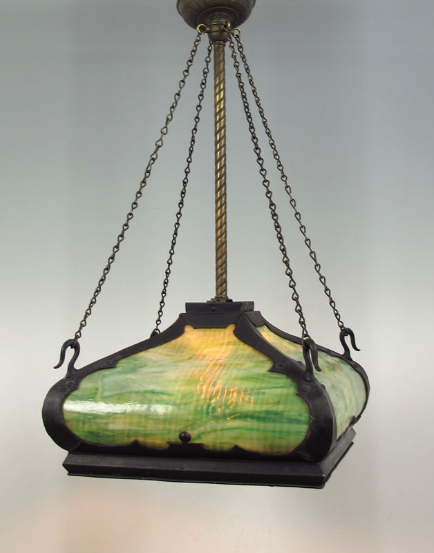 ARTS & CRAFTS BENT PANEL CHANDELIER: Green slag glass. Overall 30 1/4'' h. x 16 1/2''.
