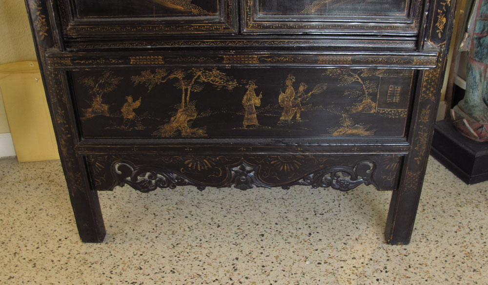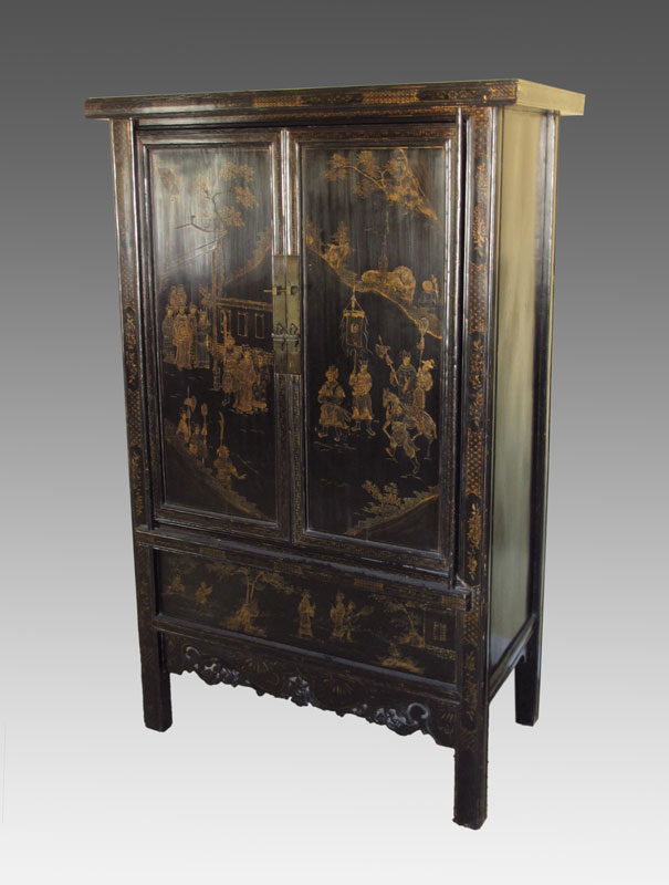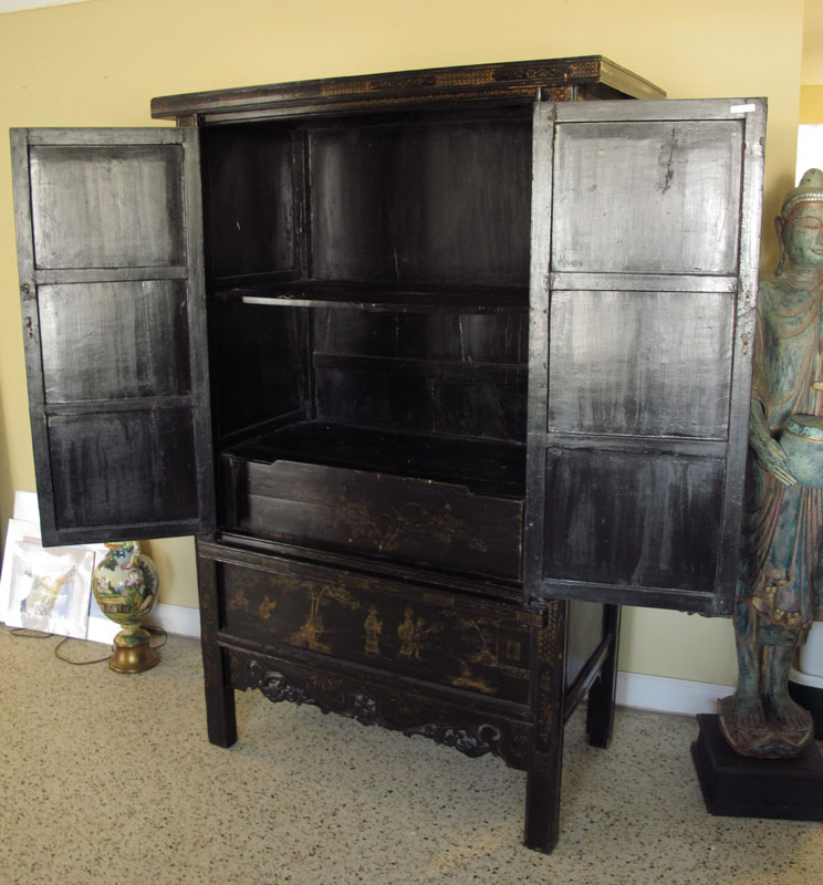 CHINOISERIE DECORATED 2 DOOR ARMOIRE: Gold chinoiserie, 2 paneled doors with brass hardware. 2 interior shelves with hidden compartment. Raised on square legs with carved apron. 73'' h. x 46 1/2'' x 24''.