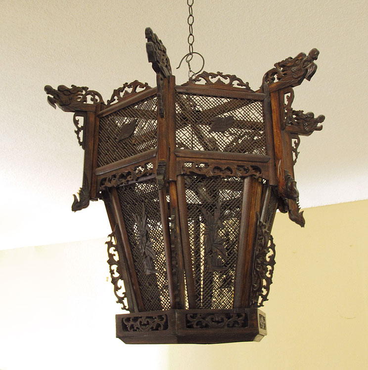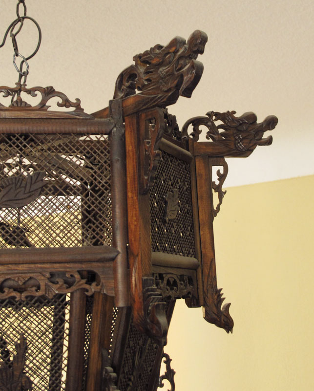 CHINESE RETICULATED WOOD HANGING LANTERN: Candle burning, with figural dragons and detailed pierce work. 18 1/2'' x 24''.