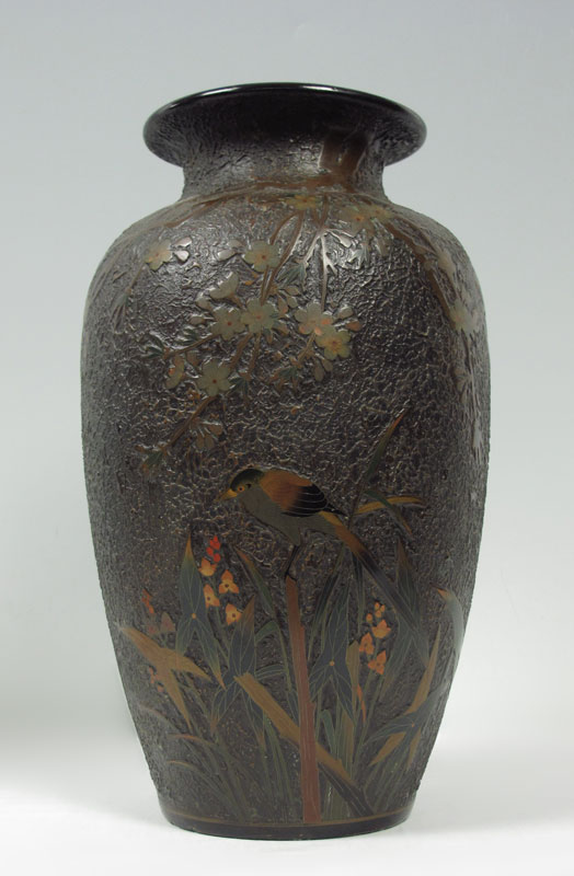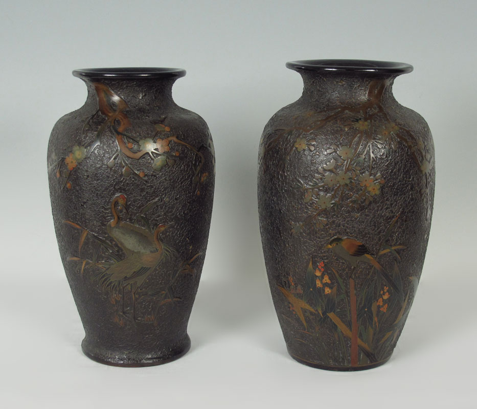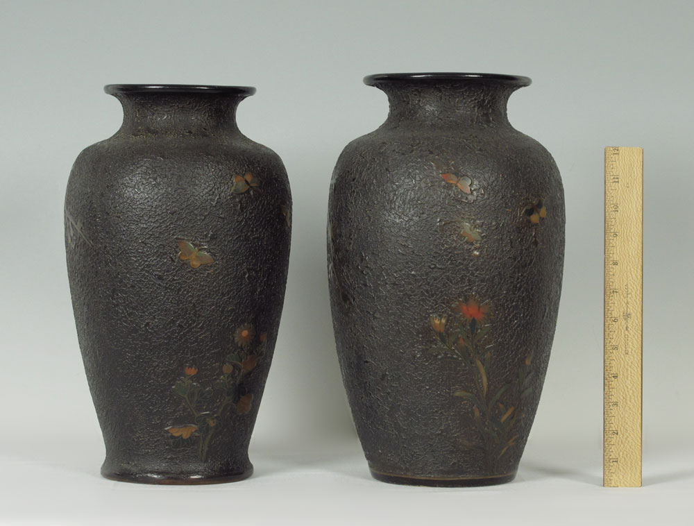 TWO JAPANESE TOTAI TREE BARK CLOISONNE VASES: Each signed in characters, decorated in bird and butterfly design on ''Tree Bark'' texture. One measures 14 1/2 tall, the other 15'' tall. CONDITION: The smaller of the two has been drilled as for a lamp.