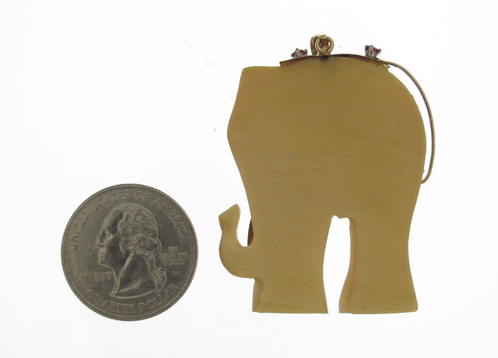 IVORY AND GEMSTONE ELEPHANT PENDANT: 14K yellow gold with ivory elephant. Eleven 2.00 mm rubies, sapphires and emeralds. Measures approx. 2'' x 1 1/2'' Gold Weight: 3.0 grams Approx.