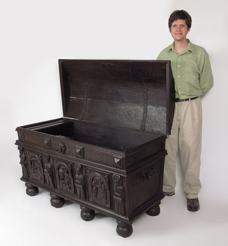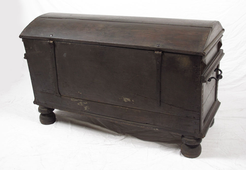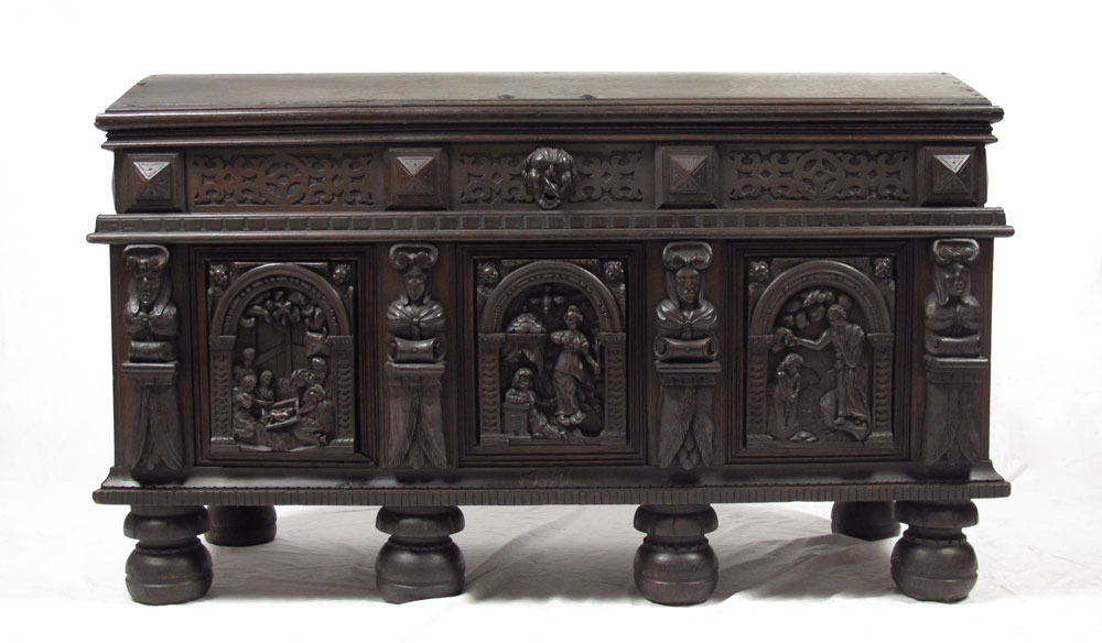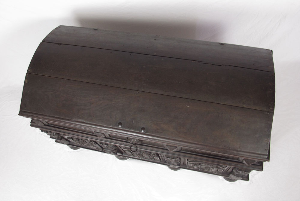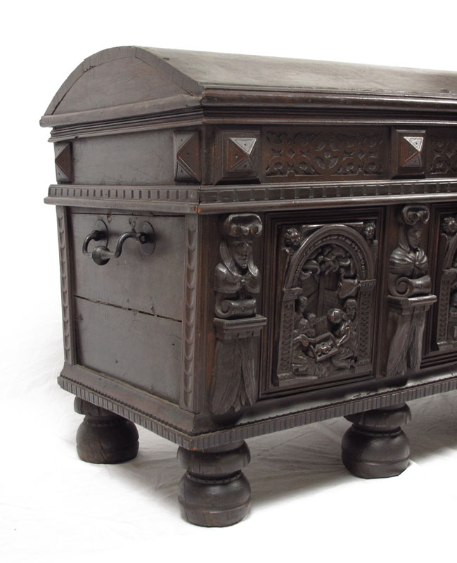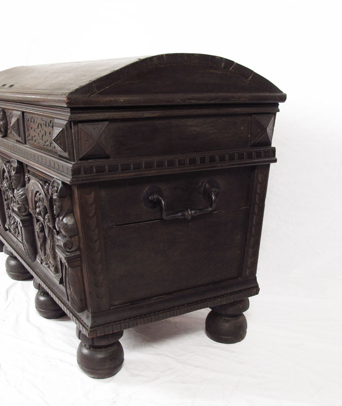18TH CENTURY CARVED EUROPEAN BLACK WALNUT DOME TOP CHEST: Richly carved chest with arched scenic carved panels of Birth, Courtship and Marriage. Interior with impressive iron hardware and lift top till. Lock with key fitted in the mouth of figurehead. Rests on bun feet. 32'' h. x 51 1/2'' x 25 1/2'' deep.