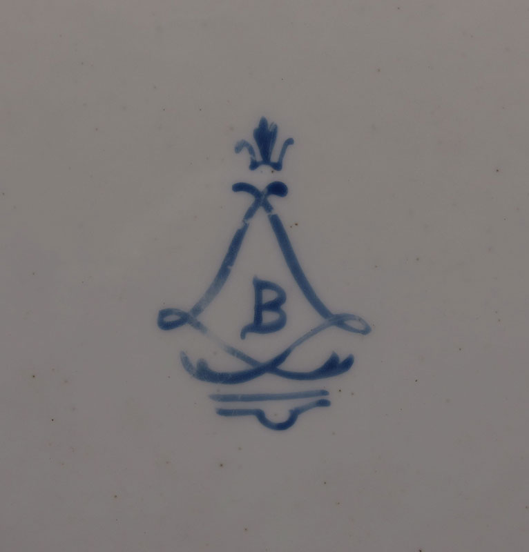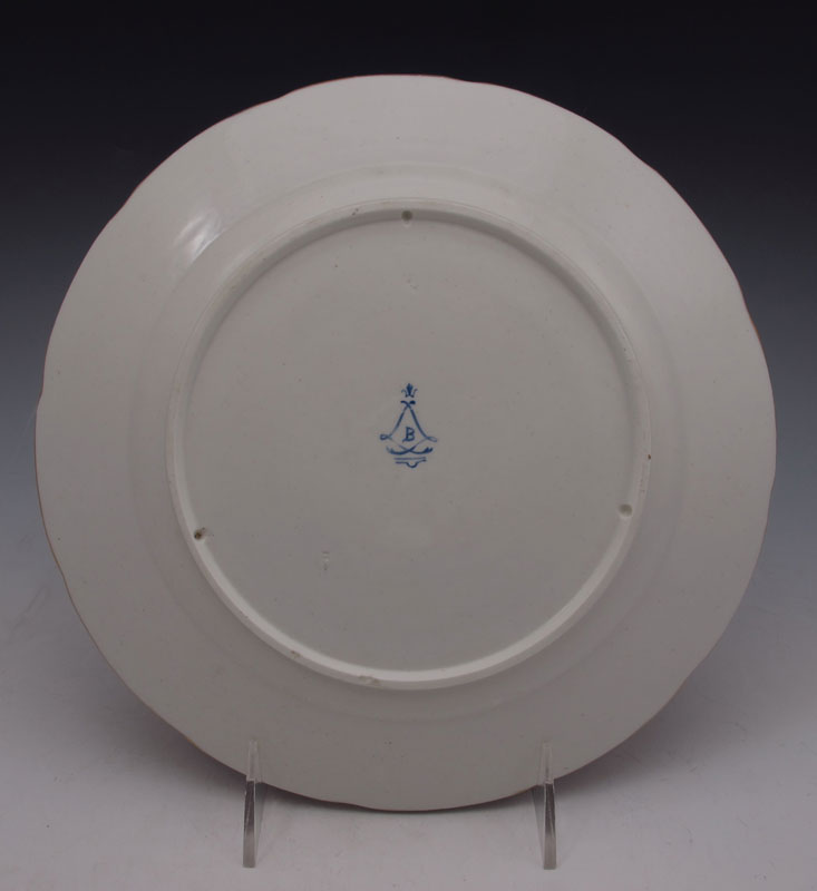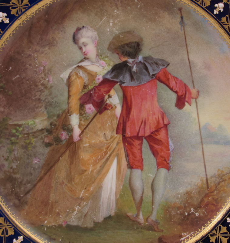 FRENCH PORCELAIN CABINET PLATE: Double Louis Sevres mark with crown. Hand painted center, enamel and gilt decoration on cobalt border. 9 3/4'' dia.