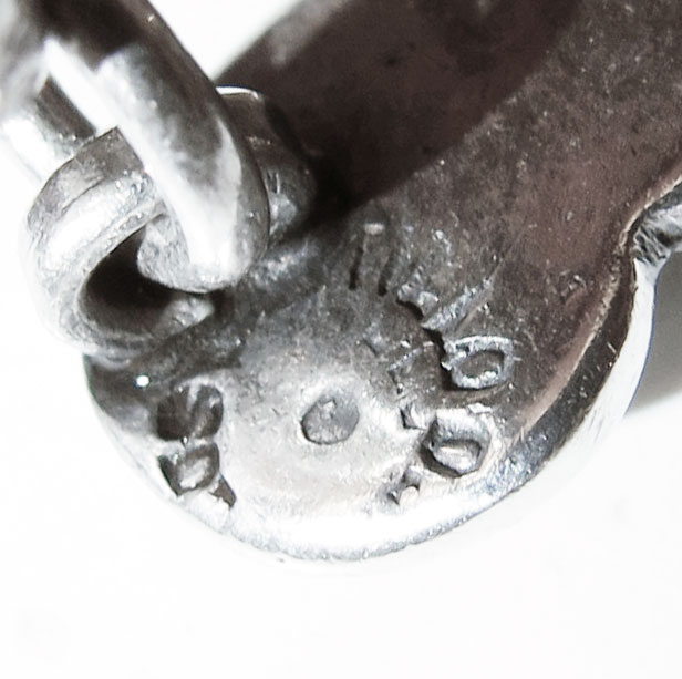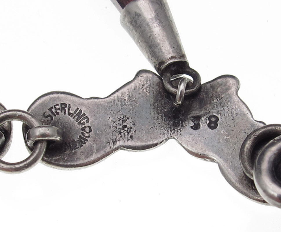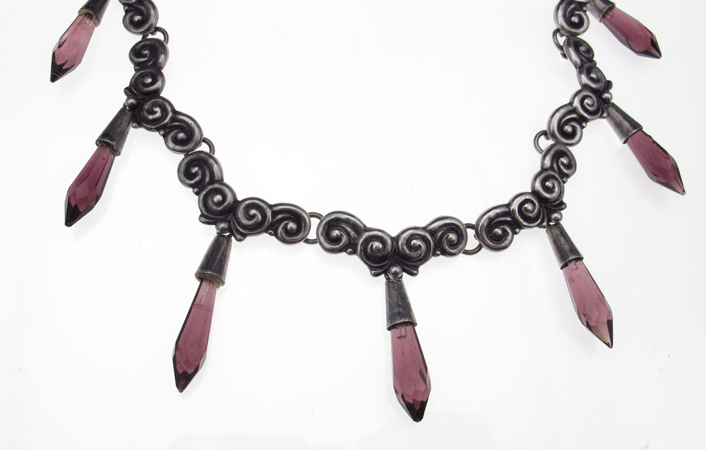 EARLY LOS CASTILLO MEXICAN SILVER NECKLACE: Scrolled link design with faceted amethyst glass drops. Marks are partially obscured under the connecting rings. Approx. 16''l. Weight 1.93 troy oz., or 60 grams.