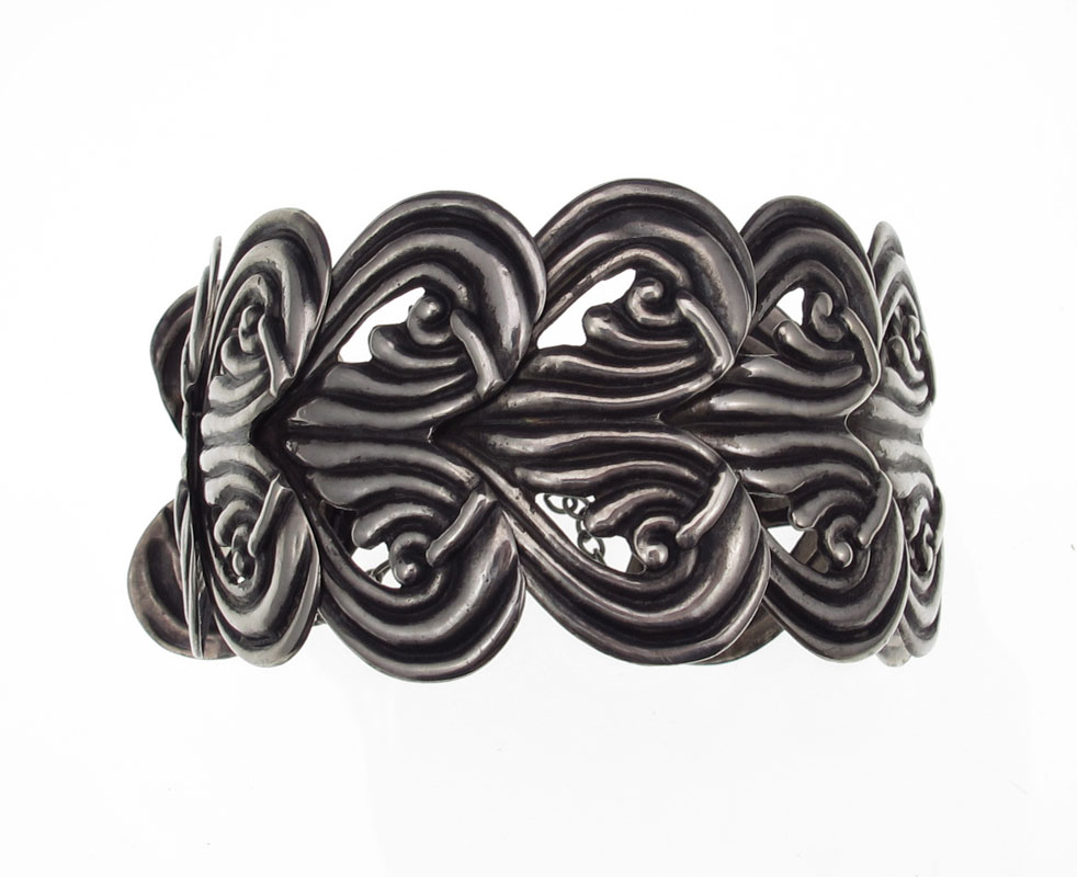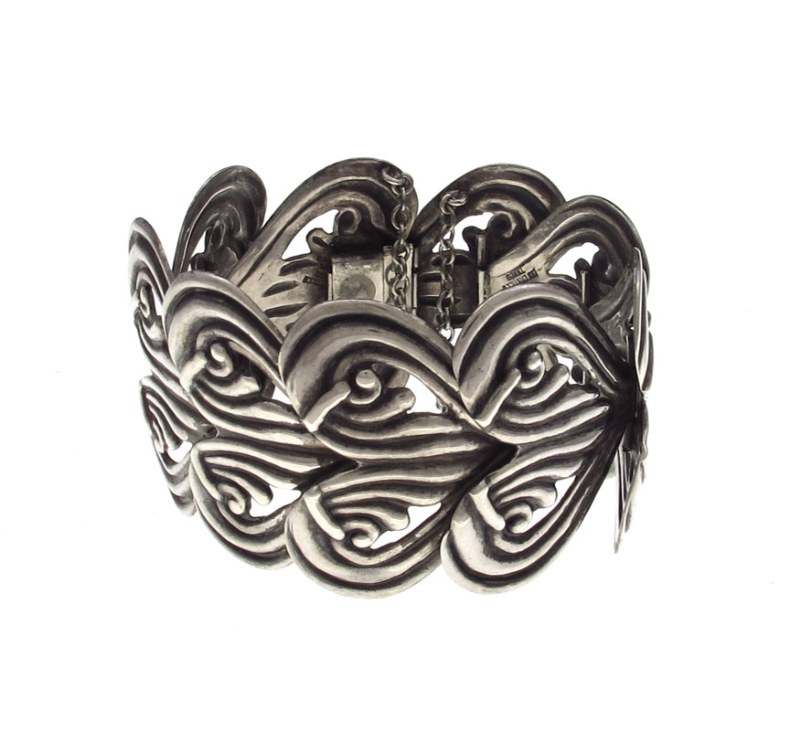EARLY LOS CASTILLO MEXICAN STERLING SILVER BRACELET: A wide articulated bracelet marked Los Castillo Taxco Sterling Made in Mexico 650. Approx. 7''l., 2'' wide. 2.37 troy oz.