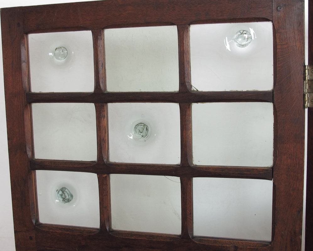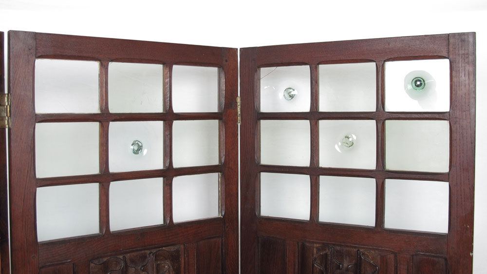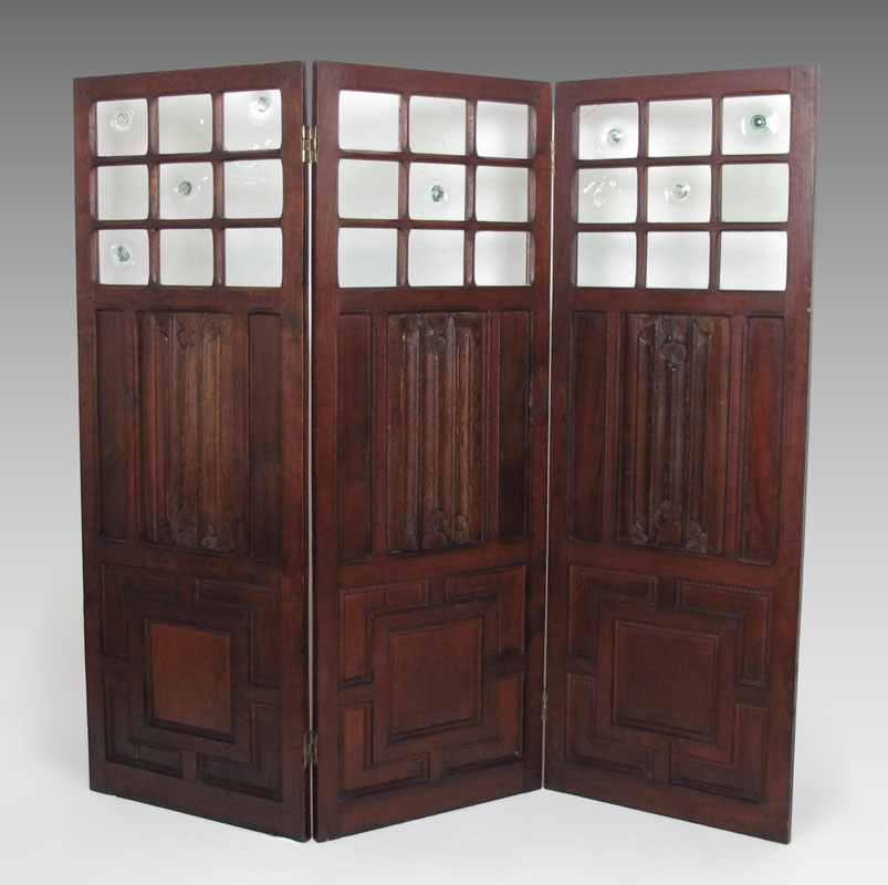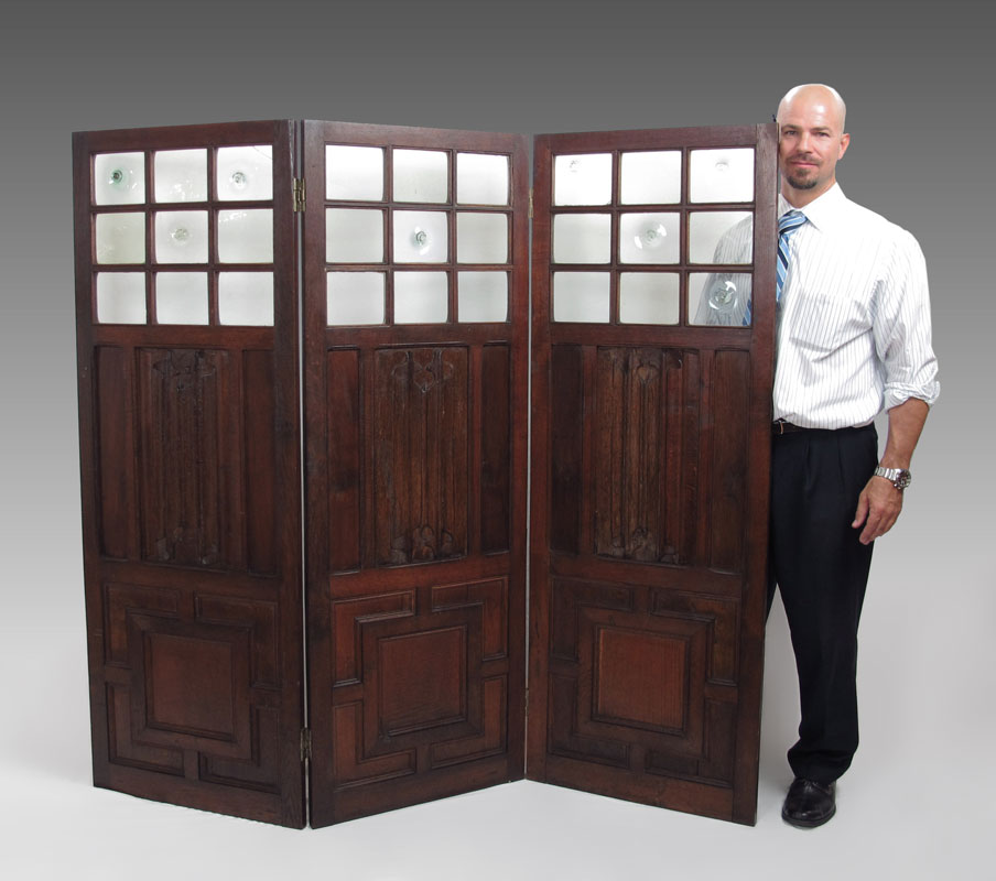 THREE PANEL OAK SCREEN WITH PUDDLE GLASS PANELS: Rich linenfold carving to sectioned panels. Ca first quarter 20th C. Each panel 66'' h. x 24''.