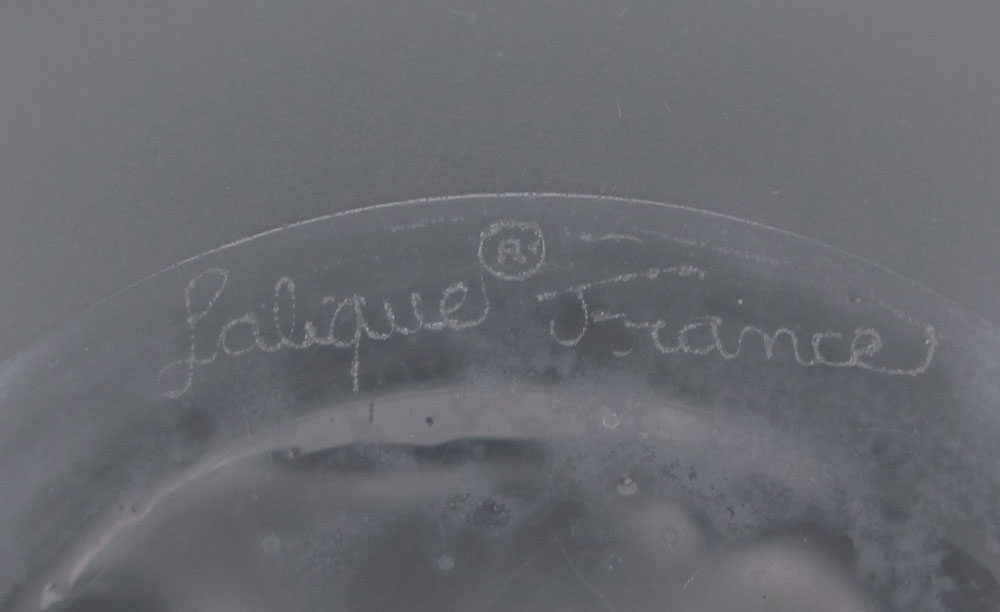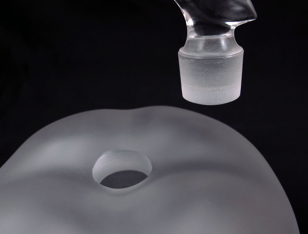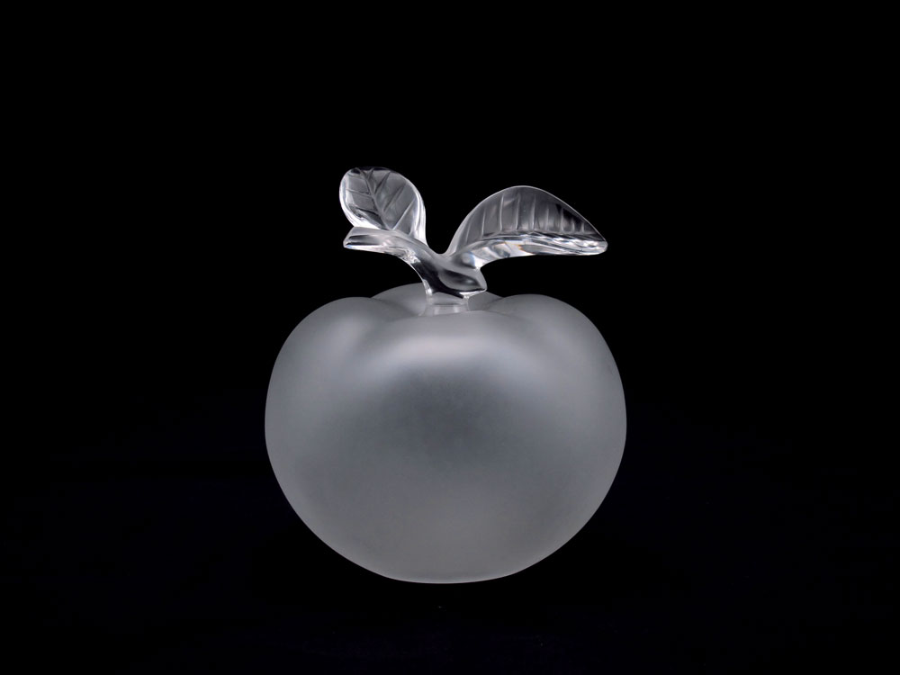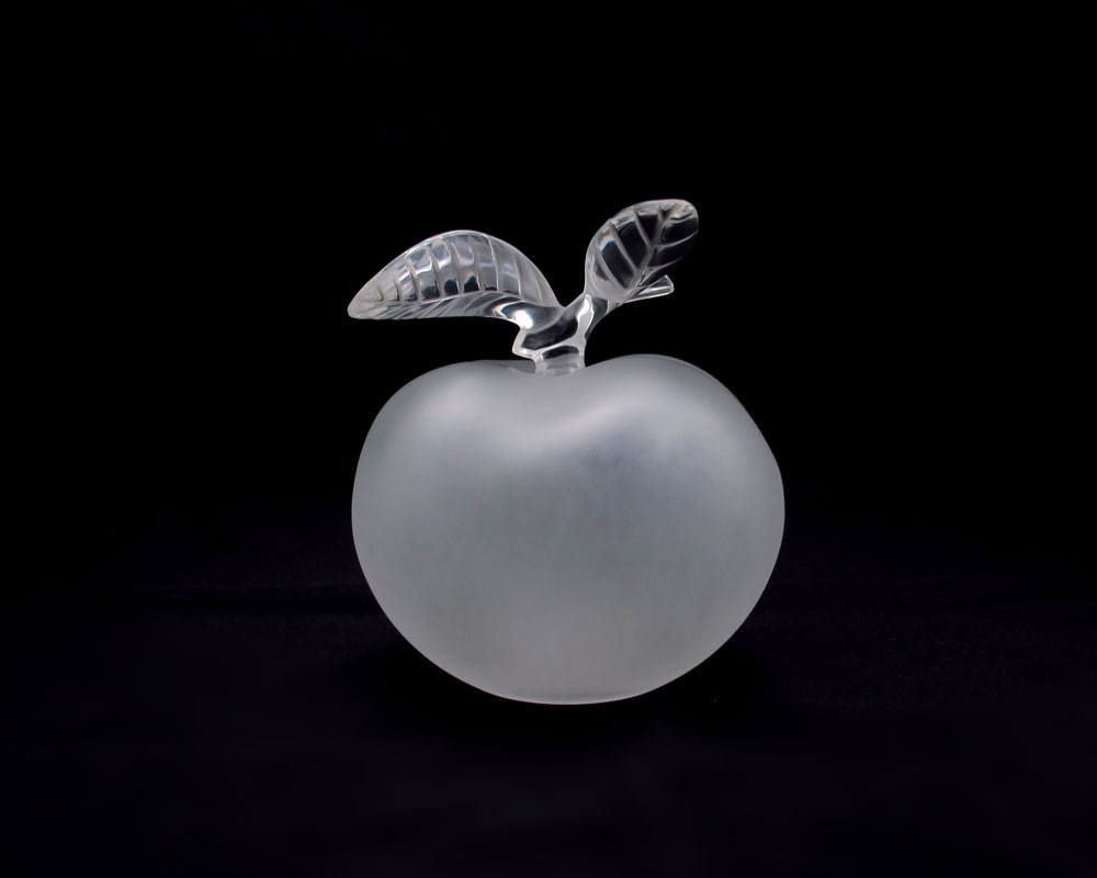 LALIQUE FRENCH CRYSTAL APPLE FORM PERFUME BOTTLE: Frosted apple with leaf form clear glass stopper. Measures 5 1/2''h. x 5'' dia. Signed Lalique France R in a circle.
