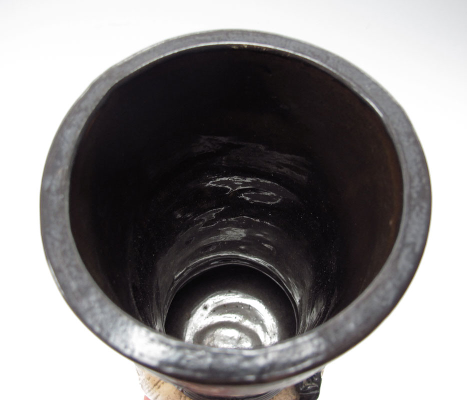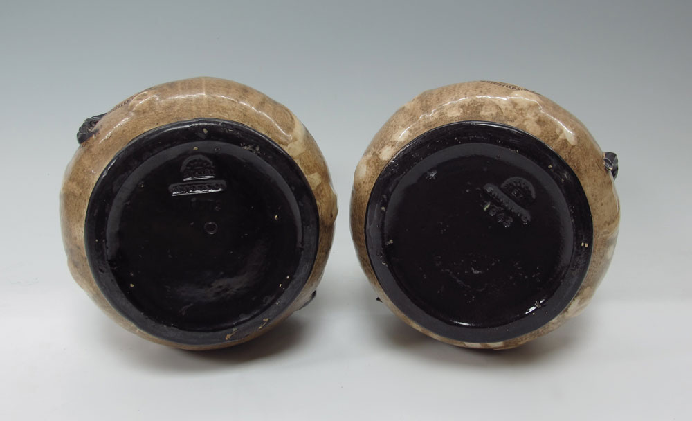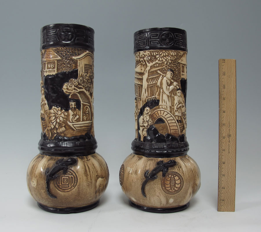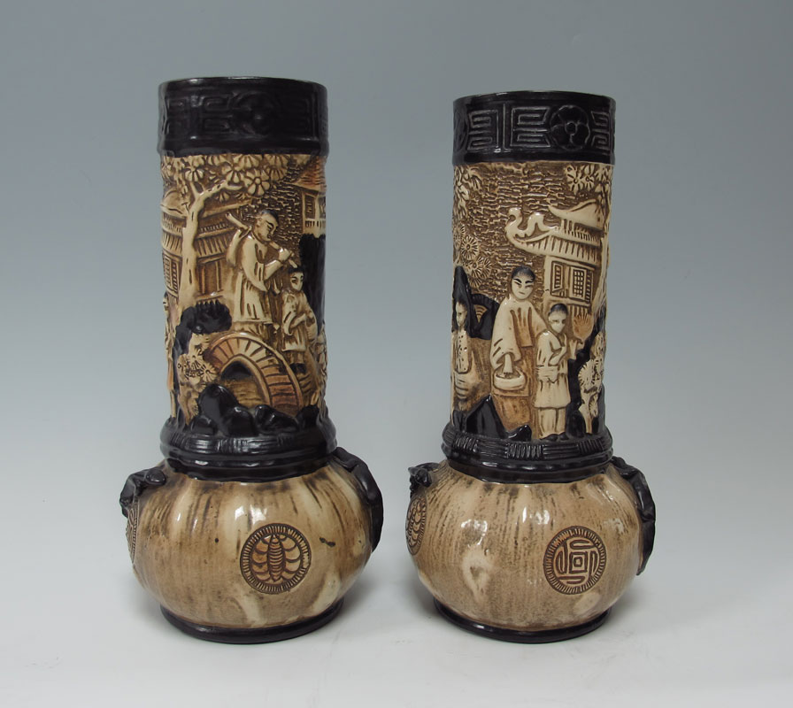 PAIR BRETBY EARTHENWARE TALL VASES: Burton on Trent, England. Impressed mark of a sun over Bretby. Decorated in the Chinese style. Measure 15'' tall.