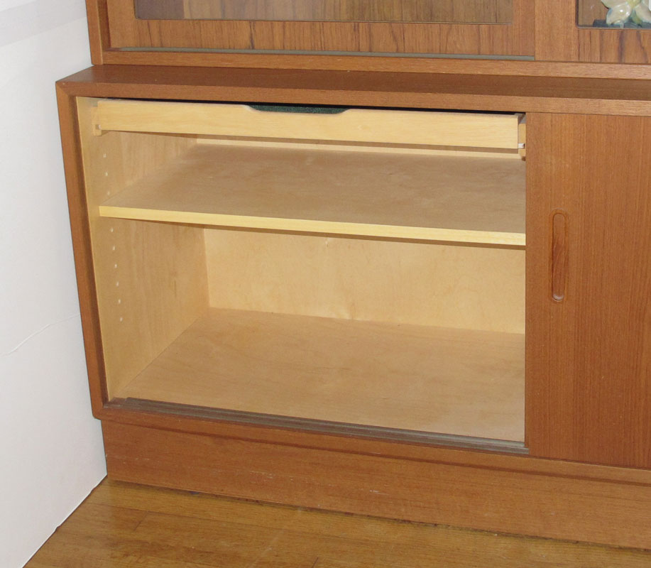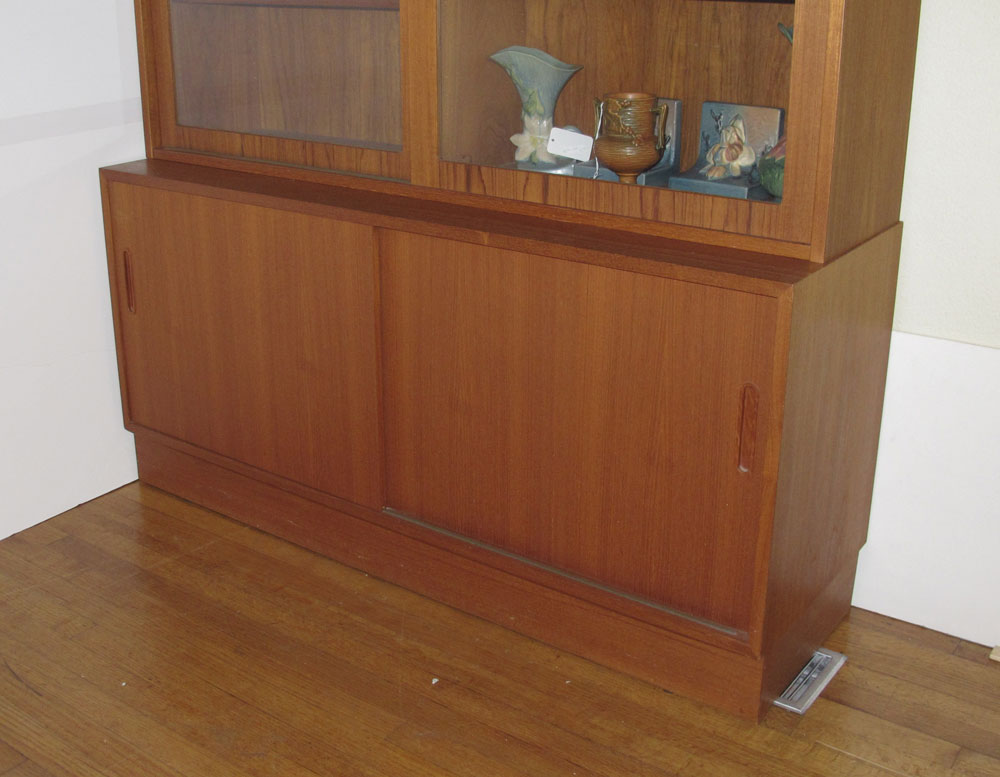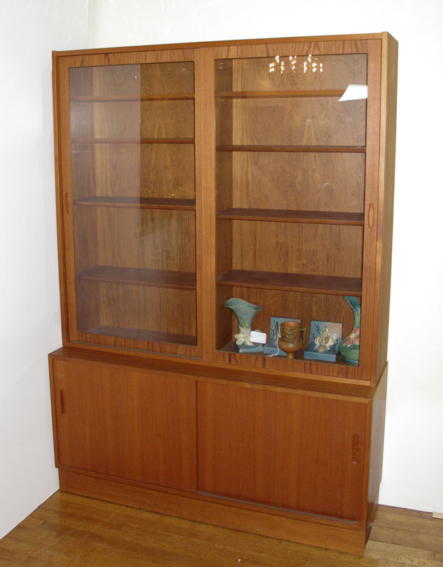 DANISH MODERN SLIDING DOOR BOOKCASE CHINA CABINET: 2 sections, top with dual sliding glass doors, 4 adjustable shelves each side. Base with 2 dual sliding solid doors, adjustable shelf each side. 77 1/4'' h. x 54 1/4'' x 17''.