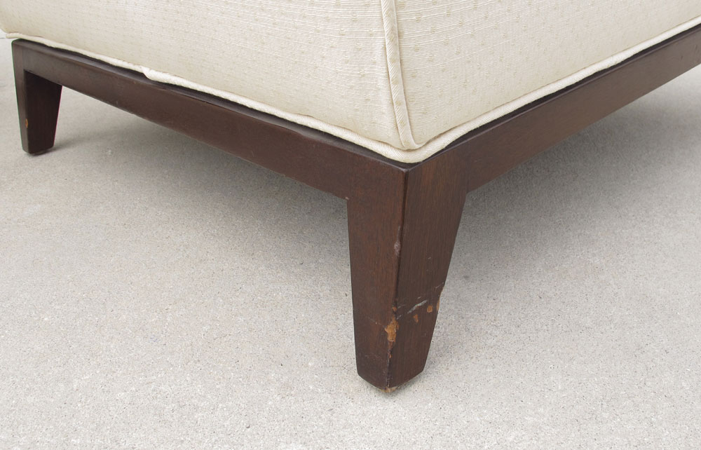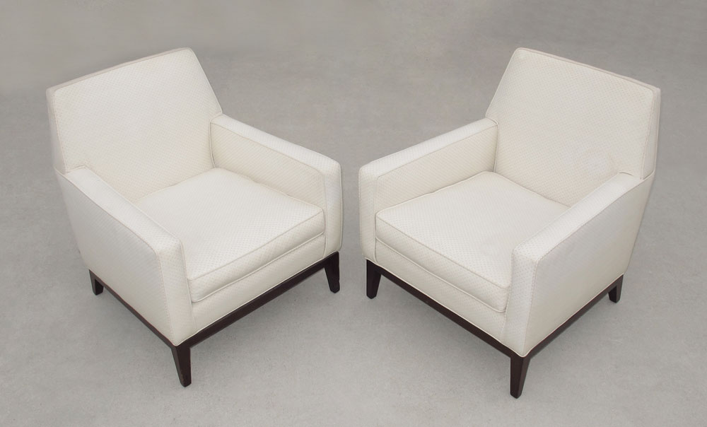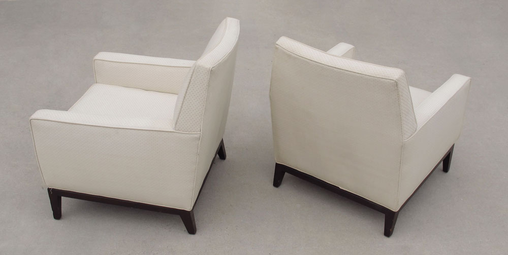 EDWARD WORMLEY FOR DUNBAR PAIR EASY CHAIRS: Upholstered, on wood legs. 31'' h. x 27'' x 30''.